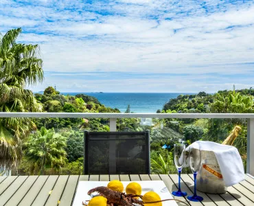 The north facing deck area is full of sun providing the perfect place to enjoy a BBQ dinner and a glass of that great Waiheke wine while overlooking beautiful Palm Beach and beyond.