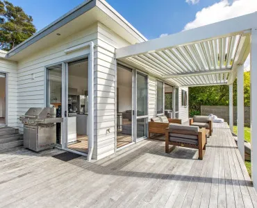Next to the kitchen is a large family dining table with seating for up to 8 guests. There is a further outdoor dining table for Al Fresco dining and a large gas BBQ for cooking up a storm on the deck. The deck is fully fenced and can be secured to keep young children and pets safe.