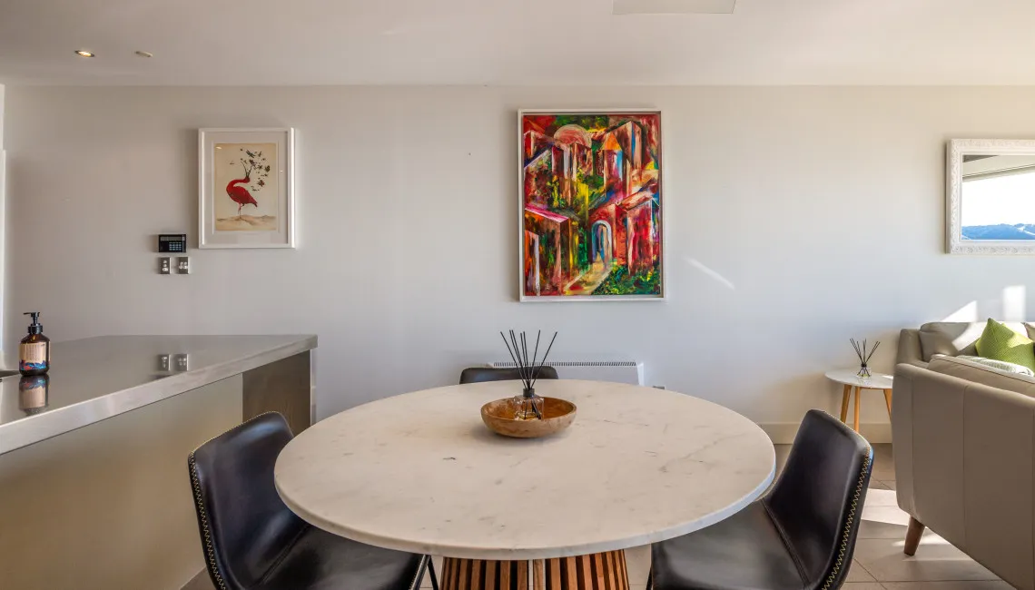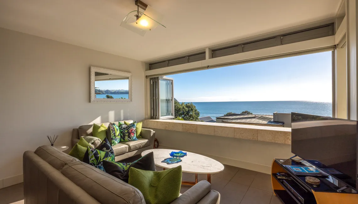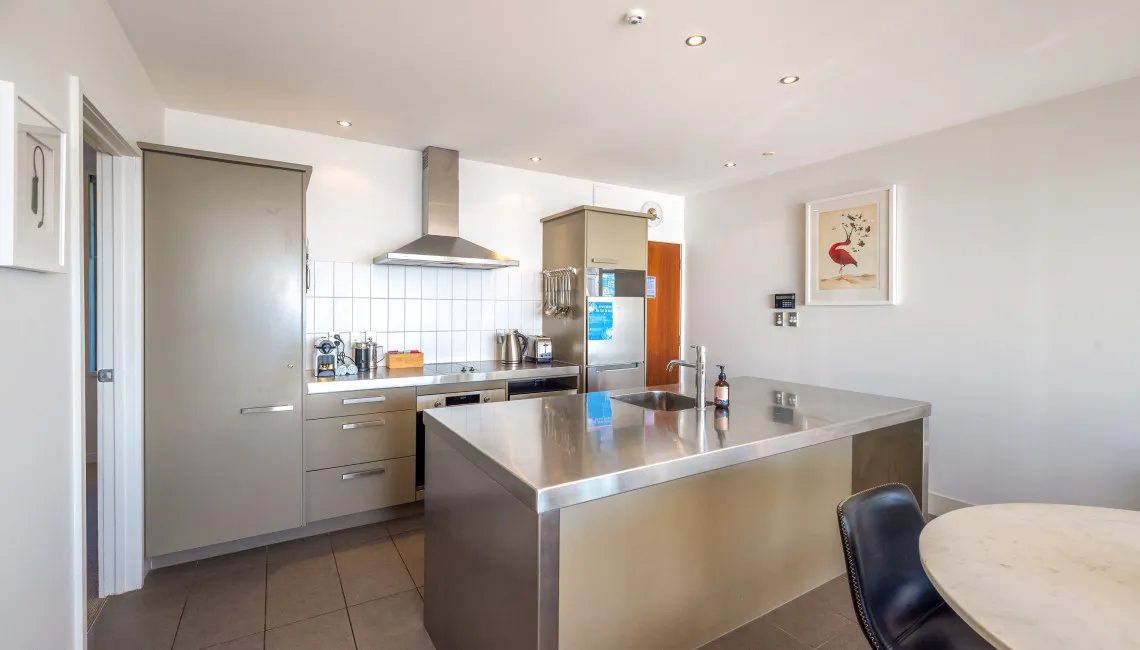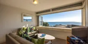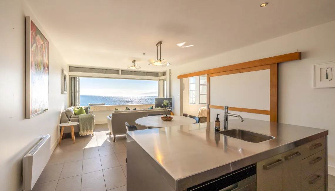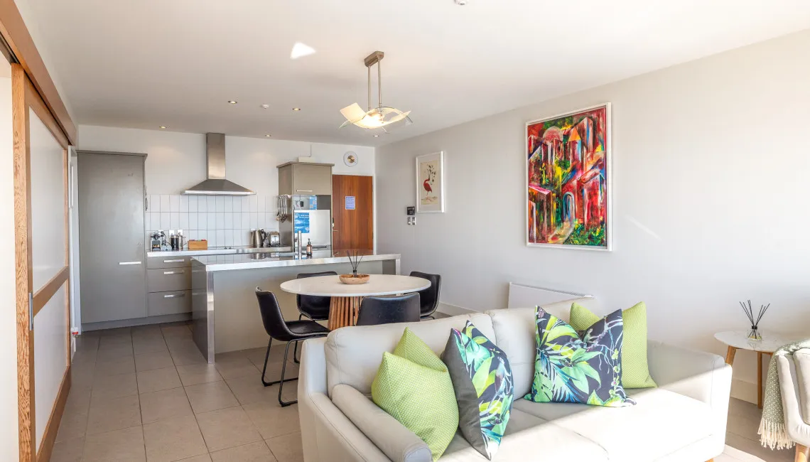 Complete with 2 bedrooms, both with en-suite bathrooms, an open plan lounge, dining and modern kitchen. The lounge has large bi-fold windows that open up to gorgeous sea views a large flat-screen TV with SKY Sport, Apple TV and complimentary Wifi.