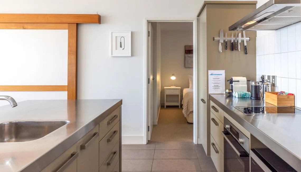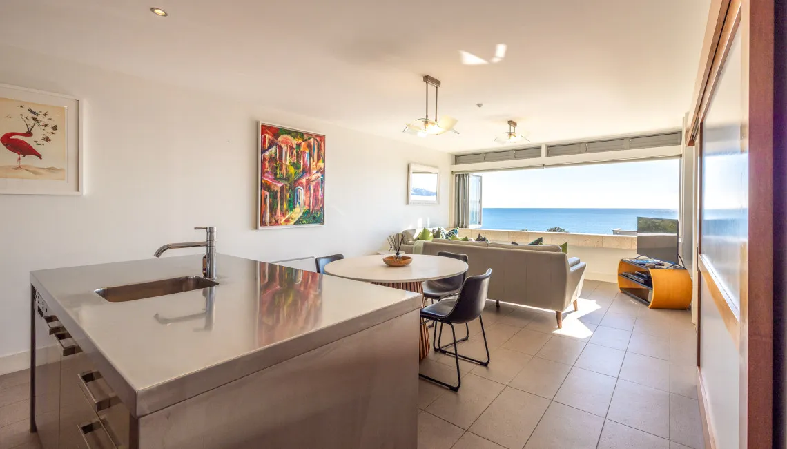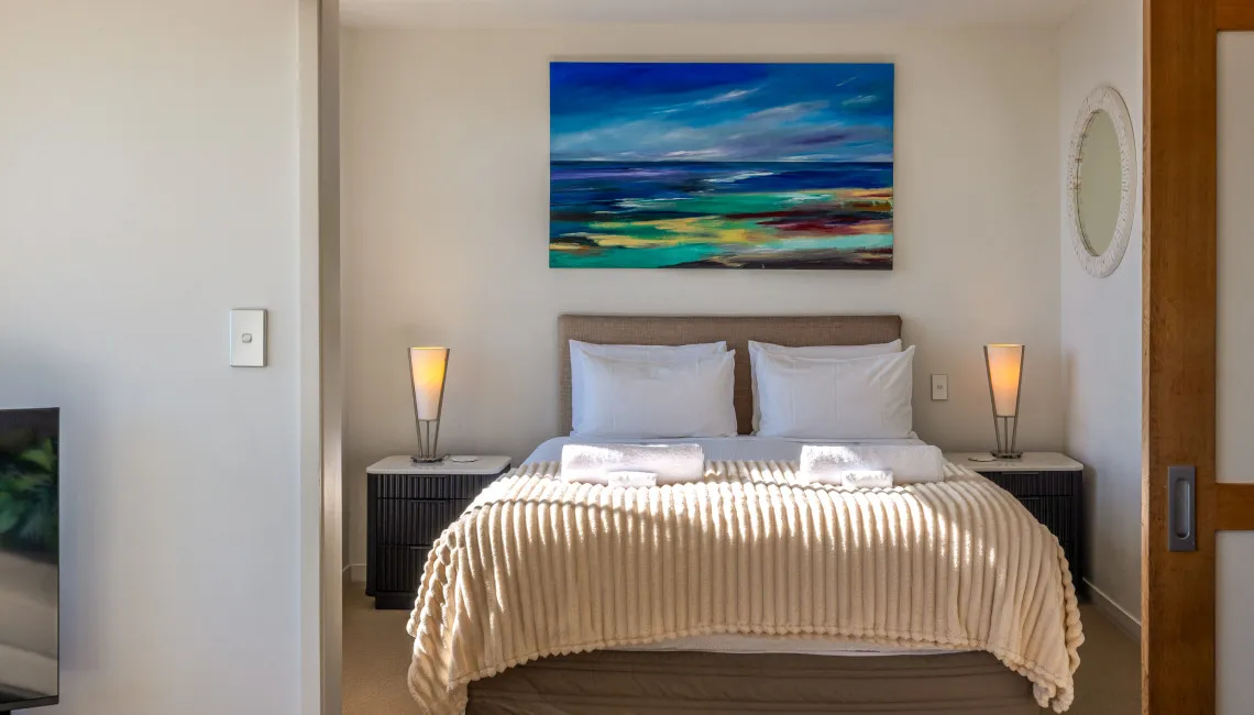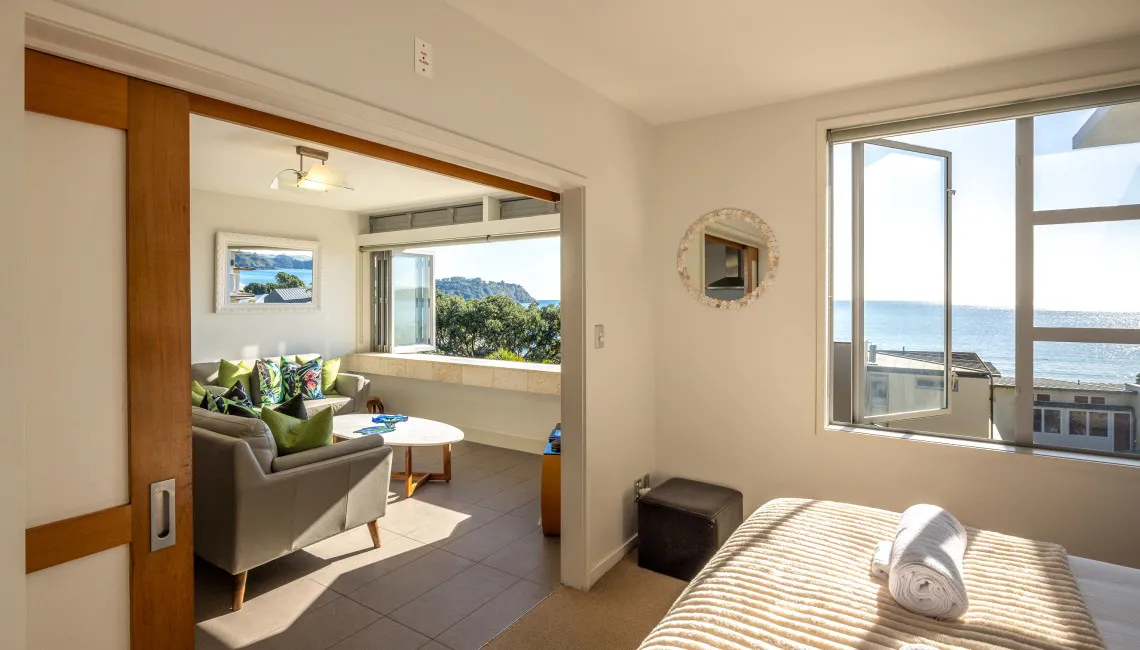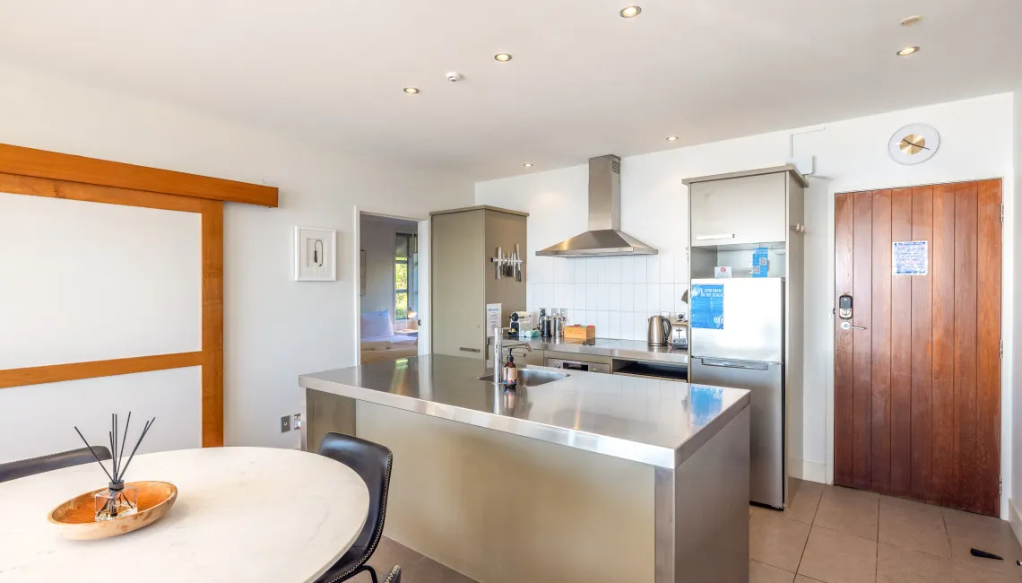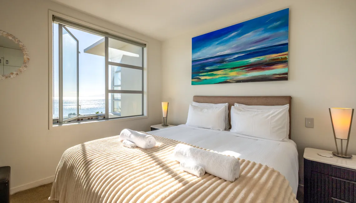 Complete with 2 bedrooms, both with en-suite bathrooms, an open plan lounge, dining and modern kitchen. The lounge has large bi-fold windows that open up to gorgeous sea views a large flat-screen TV with SKY Sport, Apple TV and complimentary Wifi.