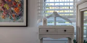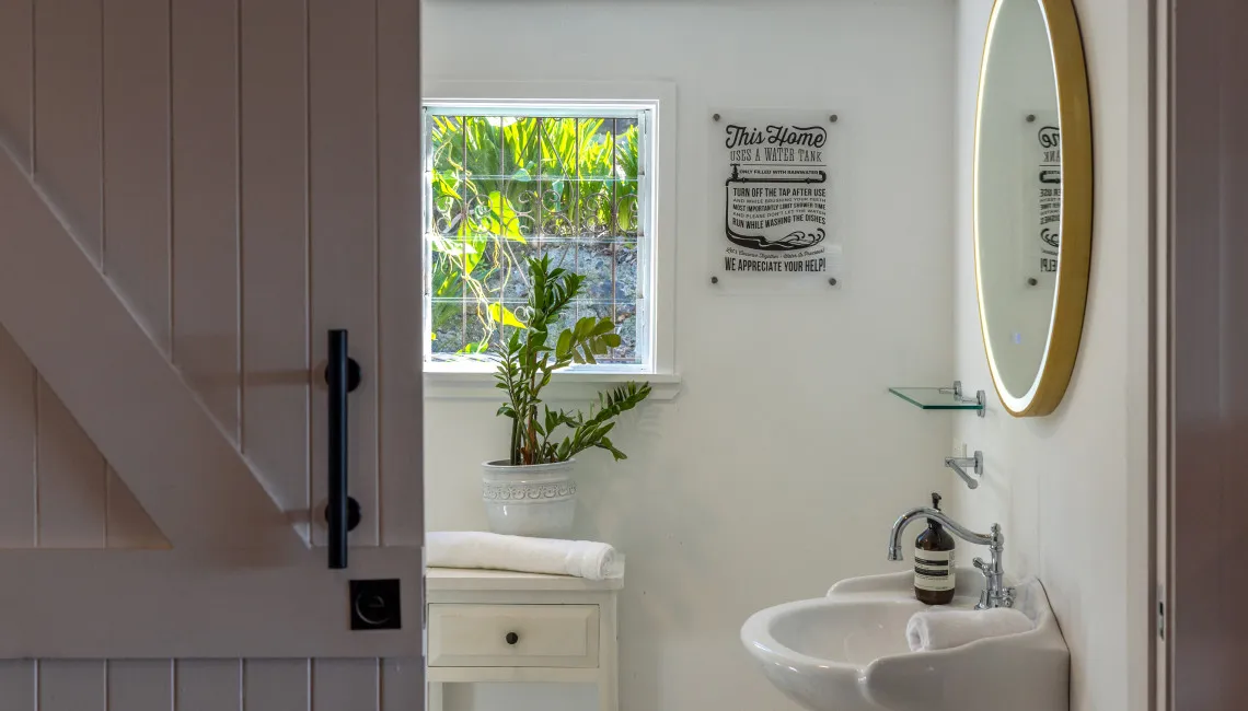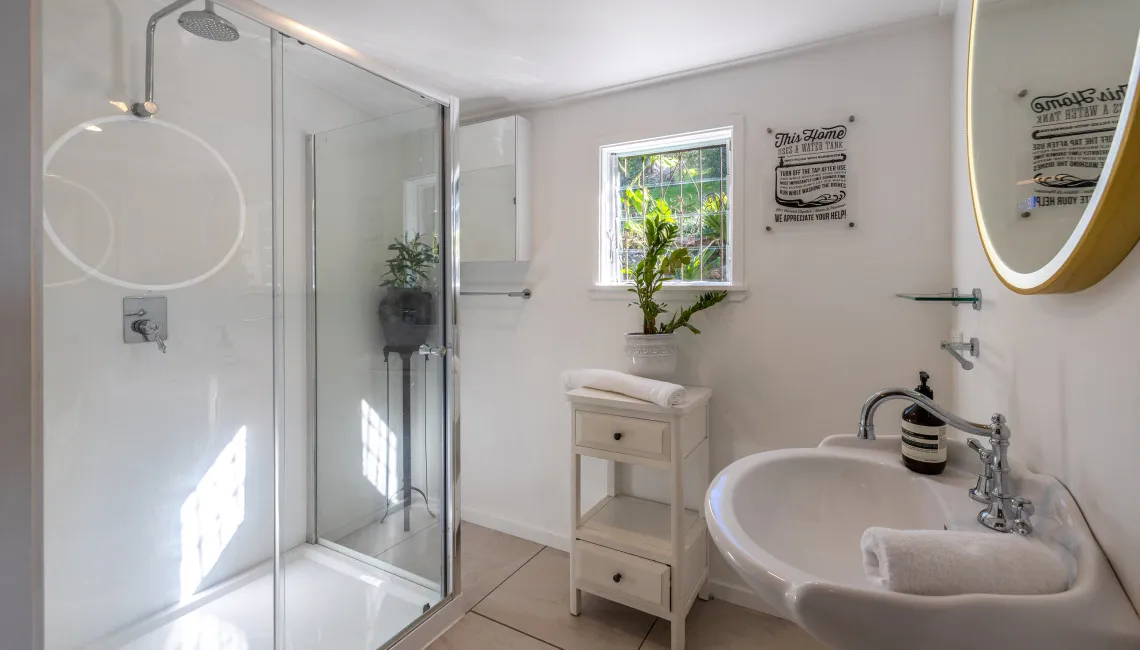 The modernised bathroom inside the main house features a contemporary shower and vanity, while the toilet is located in a separate exterior room – beautifully refurbished and accessible from both the house and the sleepout.