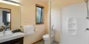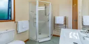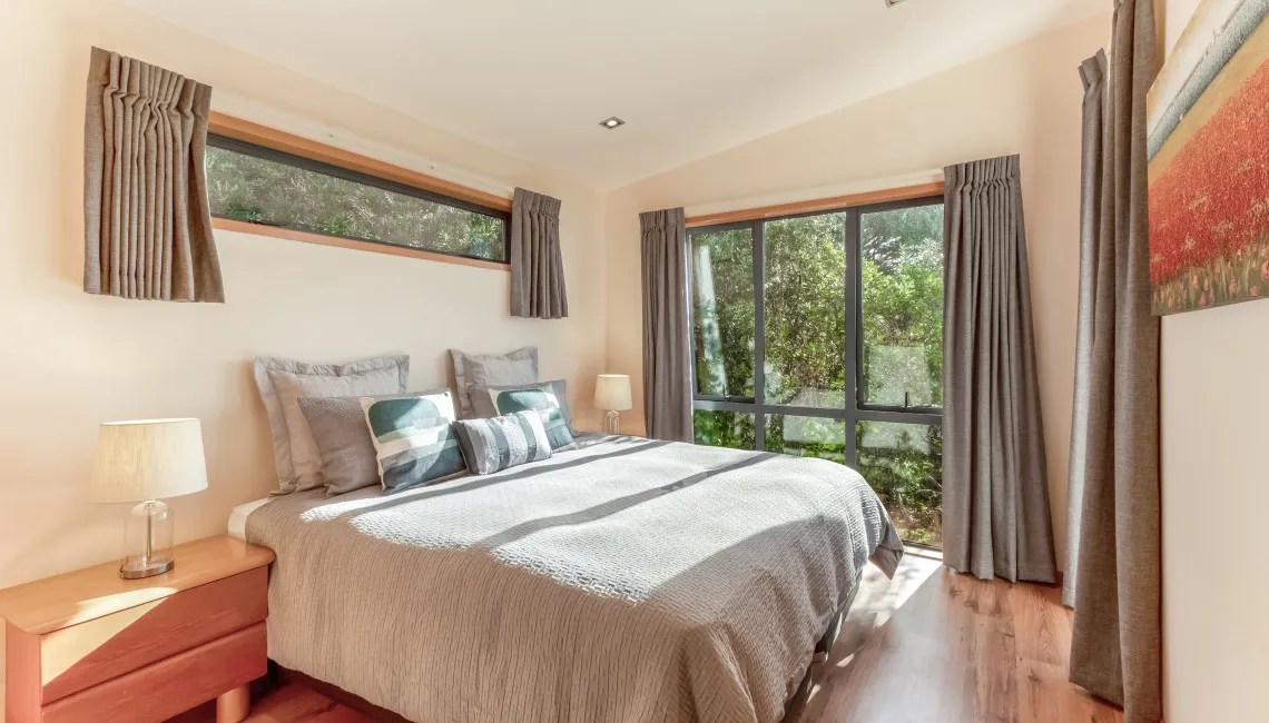 The master bedroom has a Split-King bed and an en-suite bathroom, TV with freeview, built-in wardrobe, bedside tables and lamps. This bedroom leads onto the deck and enjoys relaxing views over the beach. The other 2 bedrooms are equipped with a Queen bed in one and a Split King in the other - which can be configured as a king or two king-singles.