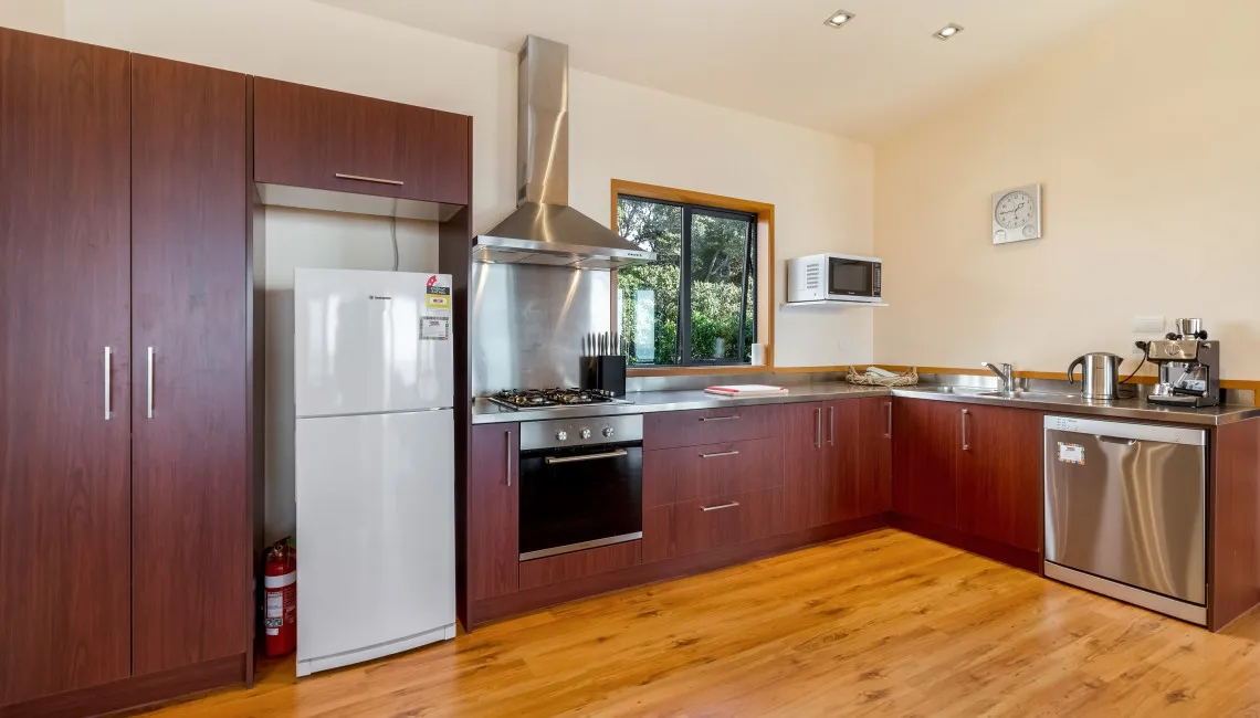 A large open-plan area features a kitchen, fully equipped with all the wares you might need for hosting family gatherings or whipping up a gourmet meal, just add groceries!