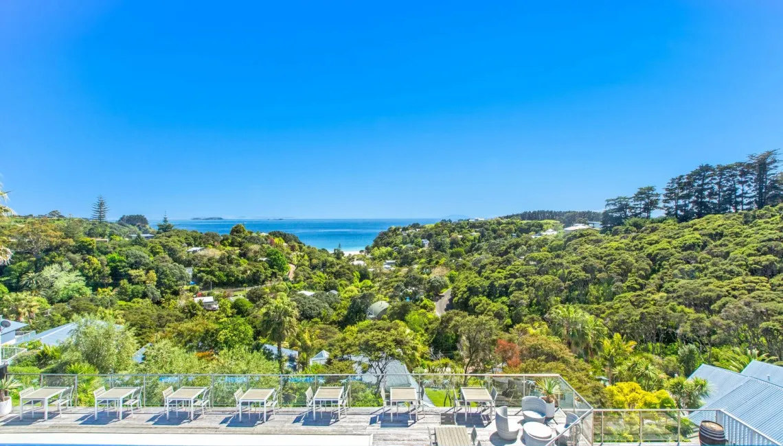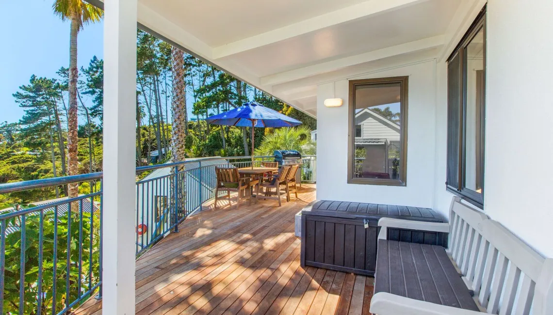 The north facing deck area is full of sun providing the perfect place to enjoy a BBQ dinner and a glass of that great Waiheke wine while overlooking beautiful Palm Beach and beyond.