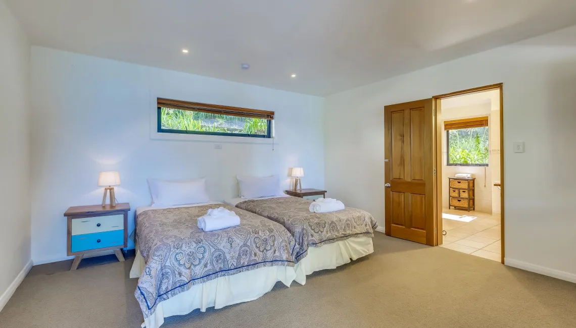 The Master bedroom upstairs has a Split-King bed, built-in wardrobe, bedside tables and lamps. The other 2 bedrooms are downstairs with a Queen bed in one and 2 king single beds in the other. There is a further lounge room with kitchenette, TV and also opens onto a further spacious deck and entertainment area overlooking the bay. The downstairs lounge has a single bed and the upstairs lounge a Cleopatra chaise lounge for an extra 2 people to stay.
