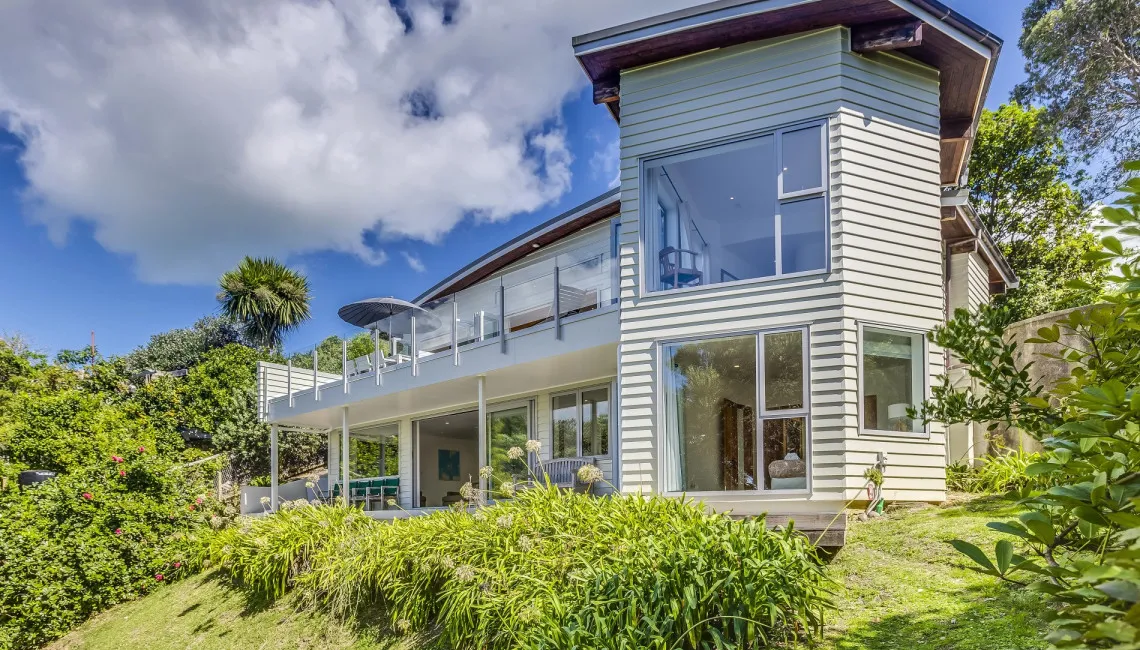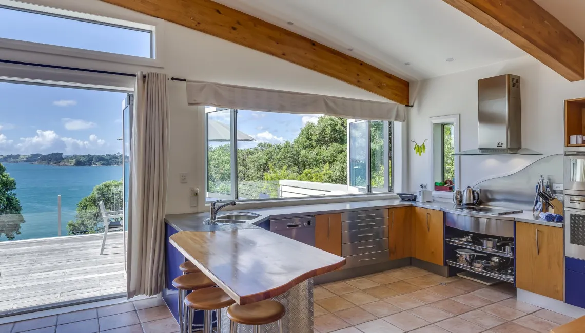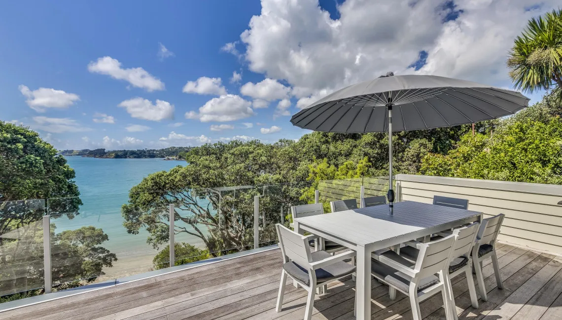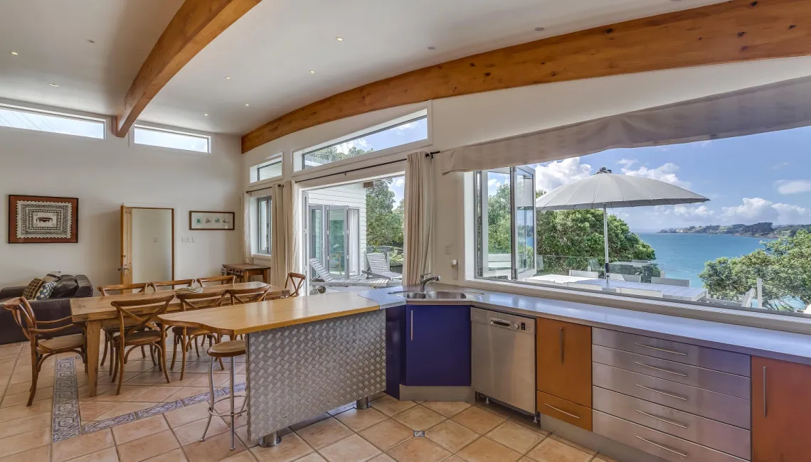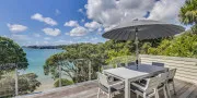 Absolute Beachfront Oneroa Bay is a quality 3 bedroom holiday home which is very well appointed and fully equipped. A super comfy property with stunning views, where you can sit on the expansive deck and watch the world go by. A large open-plan top level features a kitchen, fully equipped with all the wares you might need for hosting family gatherings or whipping up a gourmet meal, just add groceries! The kitchen then flows into a spacious lounge and dining area with full-length bi-folding doors that open onto the expansive tiled and furnished deck. Bask in the ocean breezes and savor the panoramic views as you grill up a sumptuous barbecue feast all the while watching the yachts sail in and out of Oneroa Bay.