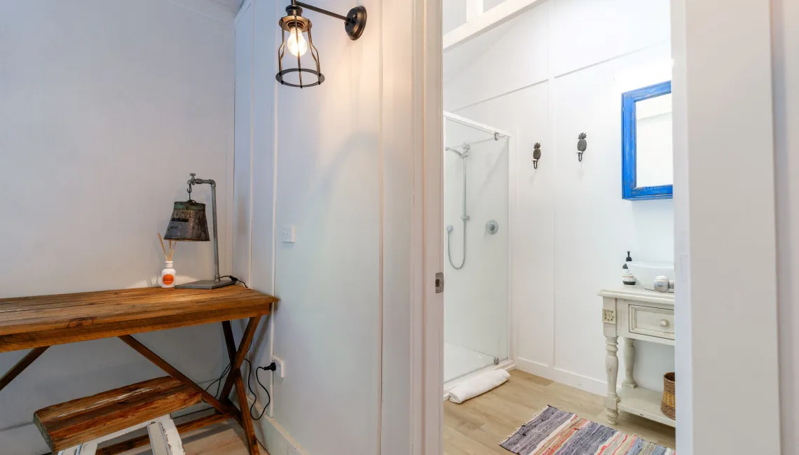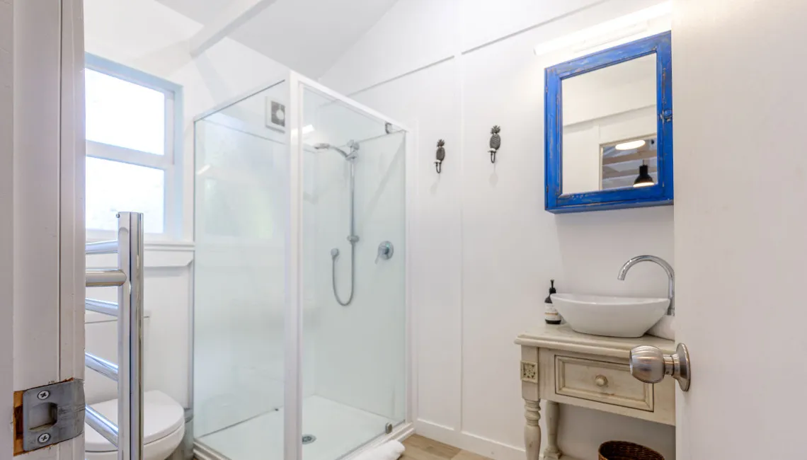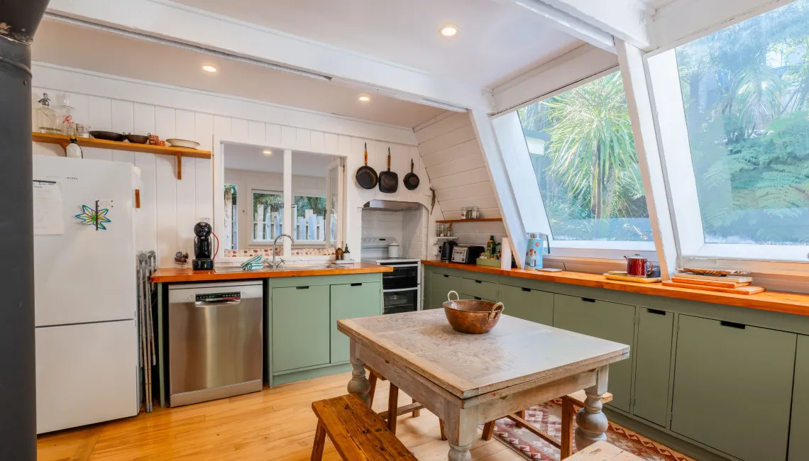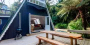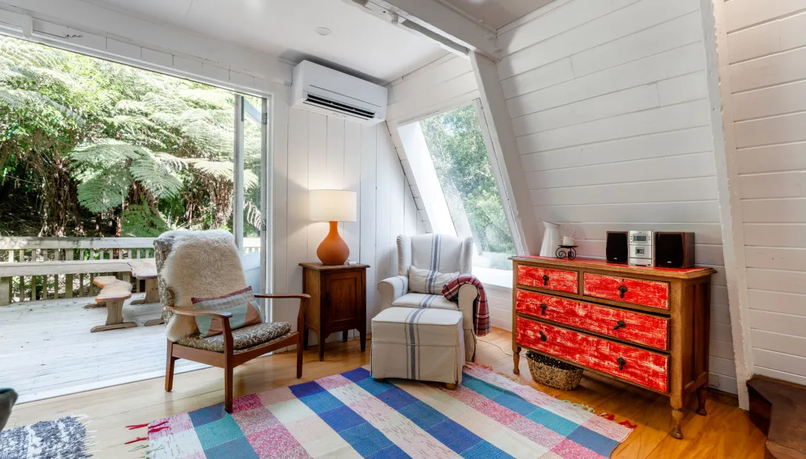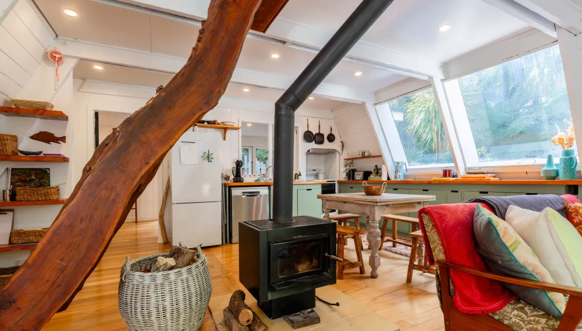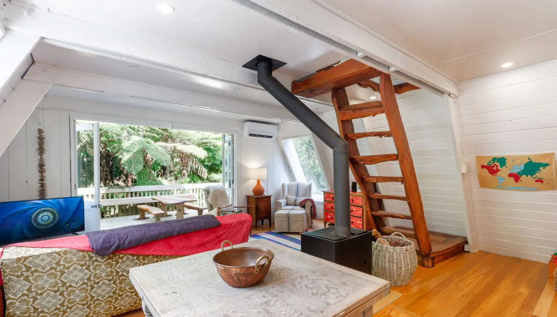 Upstairs you will find the bedroom with a comfortable queen bed and two built in single beds perfect for the kids. There is an upstairs sun-deck with French doors providing a wonderful cooling breeze in summer. During the colder months the heat from the downstairs woodburner keeps the whole house toasty and warm.