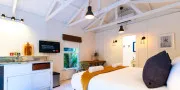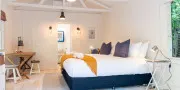A little further up the section you will find the cabana, a one-bedroom stand-alone unit, fully air-conditioned, with its own luxurious king sized bed, private en-suite bathroom, kitchenette and smart TV. This is great spot for a couple to stay and the bed can be split into two singles making it equally good for friends to share.