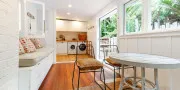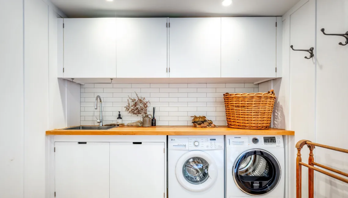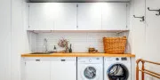 There is also a laundry area with washing machine, dryer and an area to hang clothes and do some ironing.