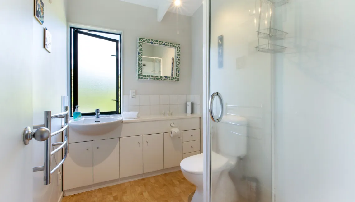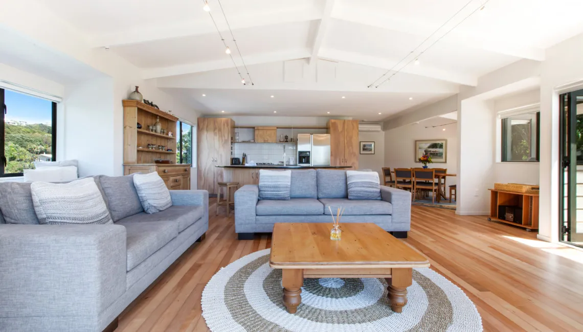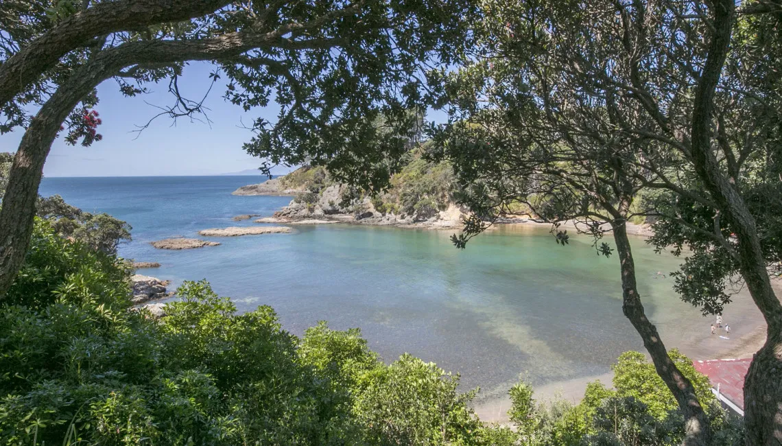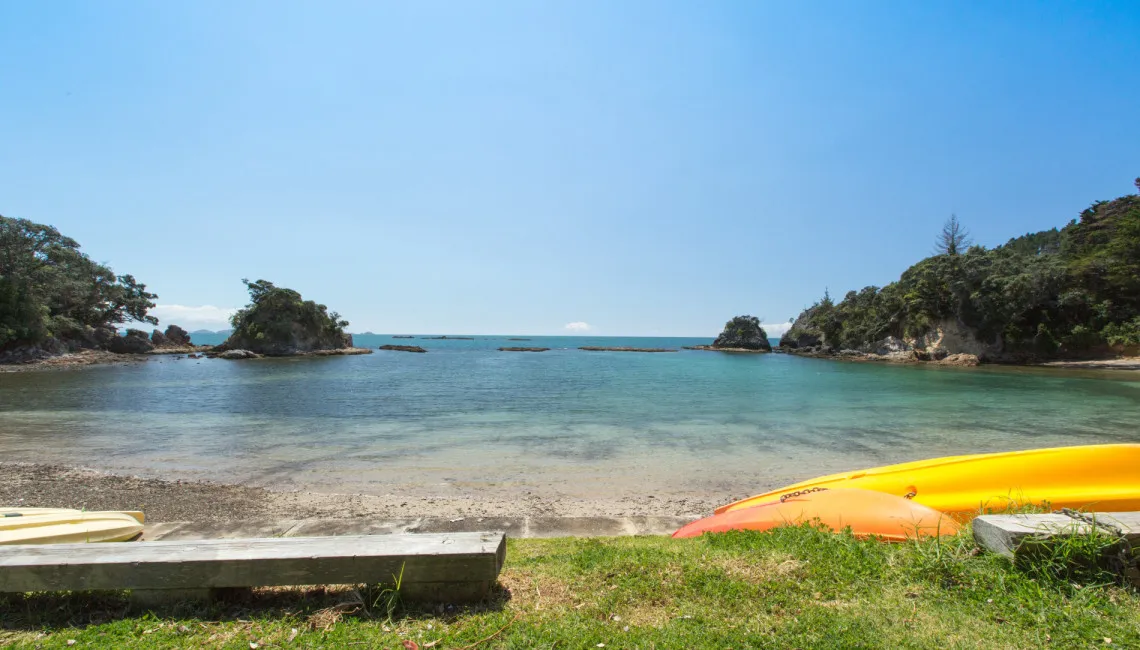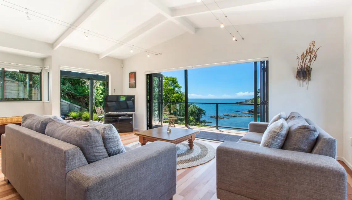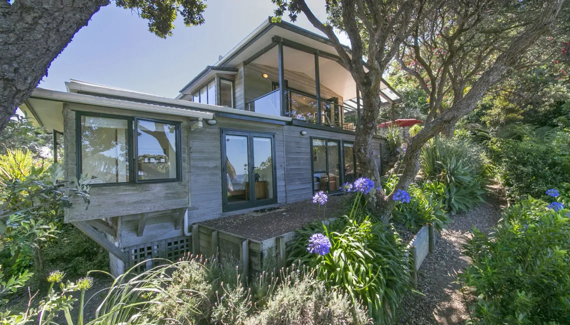 Perfectly positioned for privacy, peace and tranquility and located directly above Enclosure Bay, which is a lovely beach, perfect for little ones as it feels like a giant swimming pool and is completely safe. With caves and wonderful rock walks to be had from this location and Native Tui surrounding the property as they play and sing.