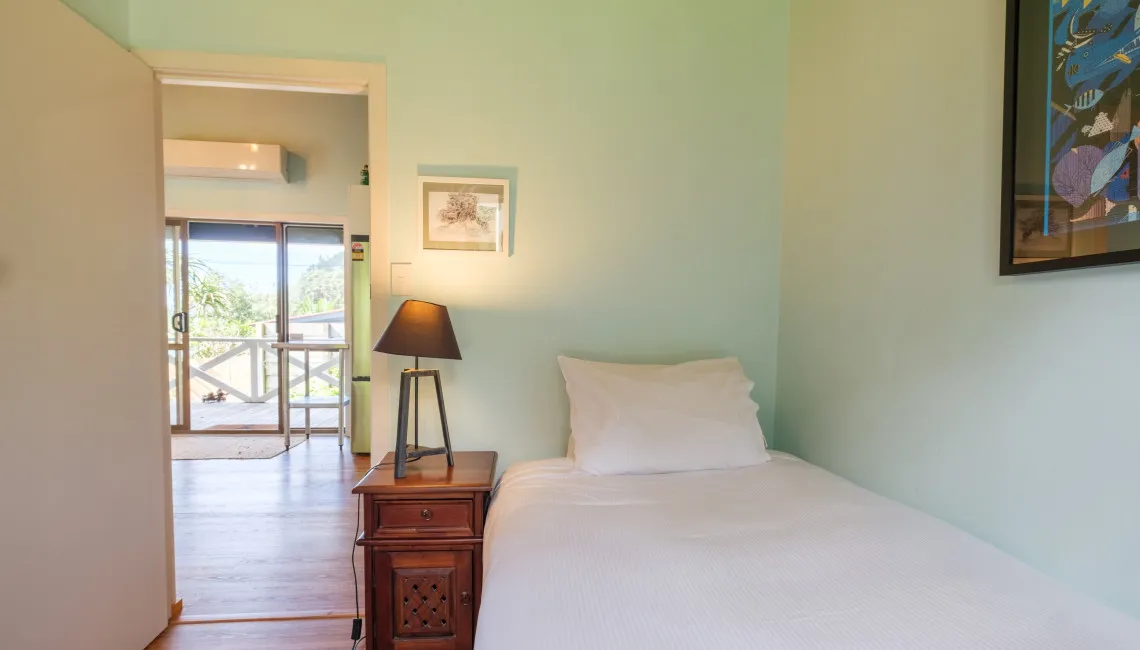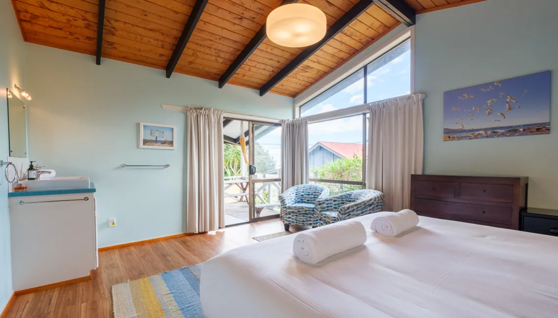 The main house has 3 bedrooms and 1 bathroom. The bed configuration has the Master bedroom with a California (split-able) King bed in a large room which opens onto the wrap around covered deck, with the view across the Bay. The second bedroom has a split king bed. and the third bedroom has a King single bed. The sleep-out which is at the back door has a queen bed and single bed along with a full bathroom.