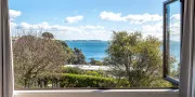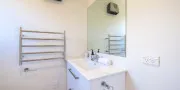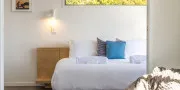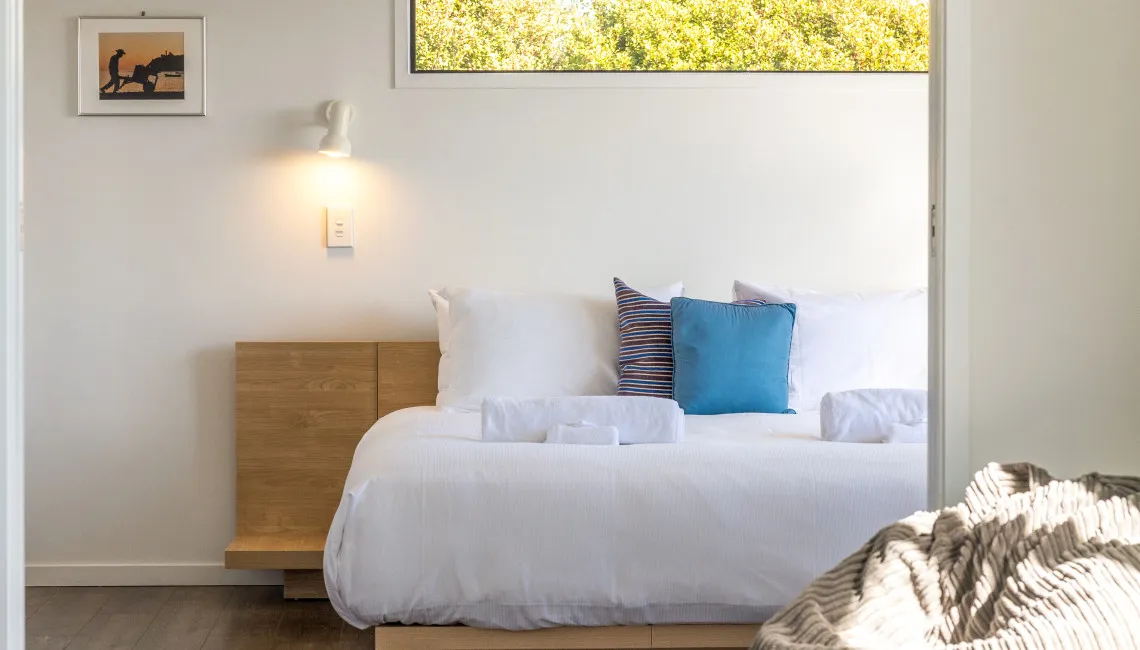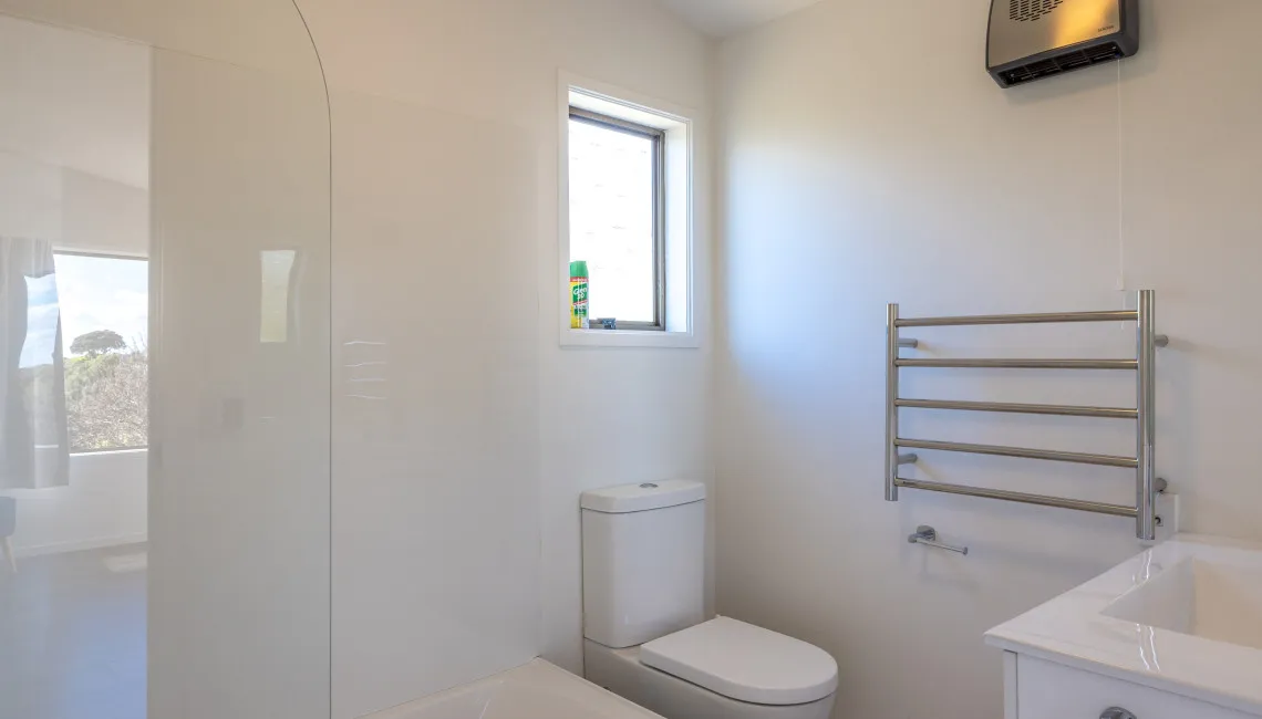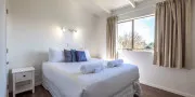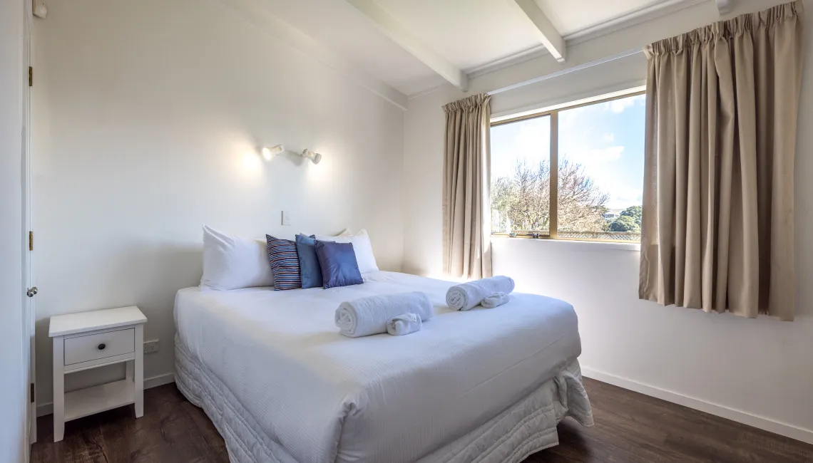 Upstairs is the master bedroom, with ensuite bathroom, walk-in wardrobe and king sized bed with a luxurious pillow top mattress. The large double windows open up completely to wonderful views over the ocean.