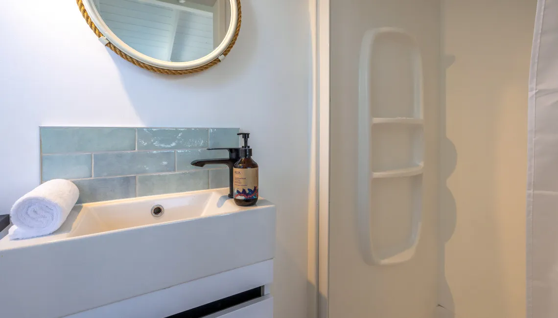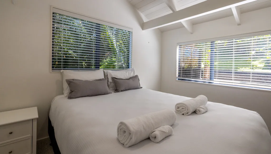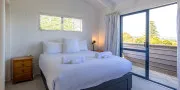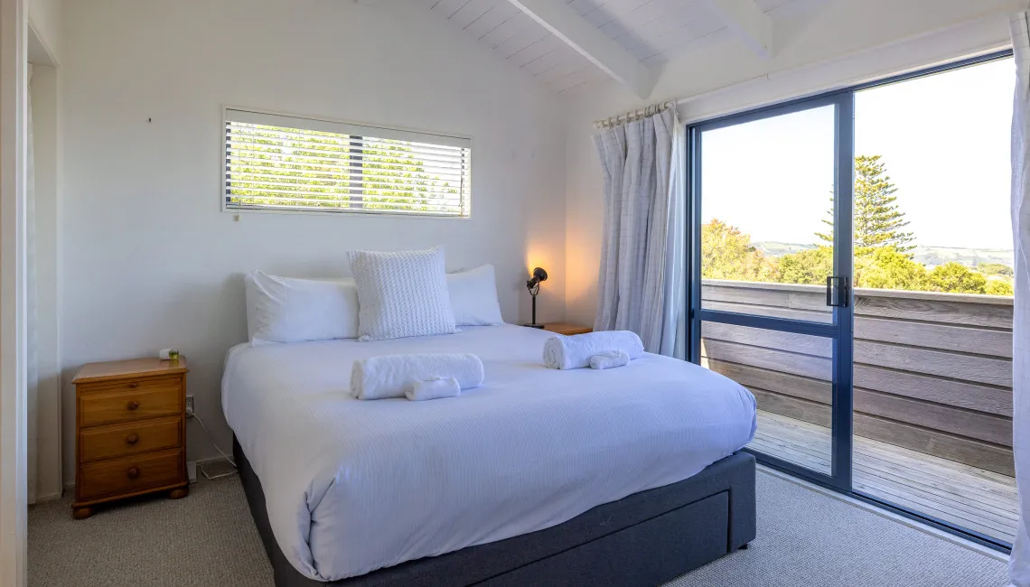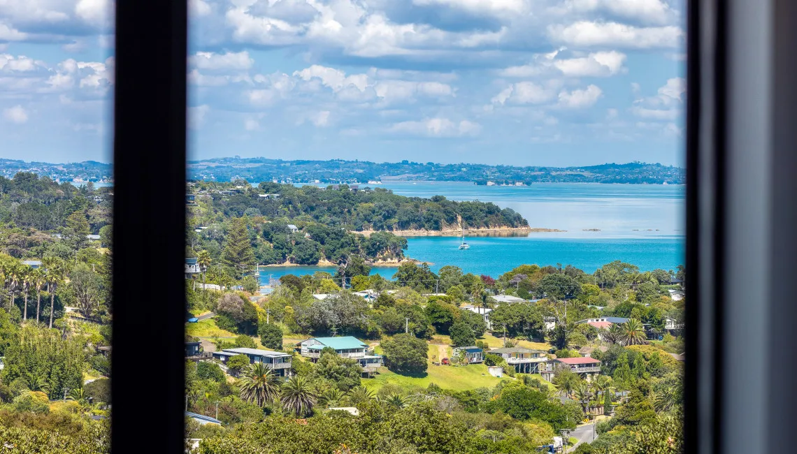 The home has been designed with views in mind, with the sparkling Hauraki Gulf visible from both levels. Upstairs, the master suite captures a stunning panorama from its elevated position. This light-filled space features a king bed, an ensuite bathroom with shower and toilet, and large windows that perfectly frame the sea — a peaceful place to begin or end the day.