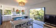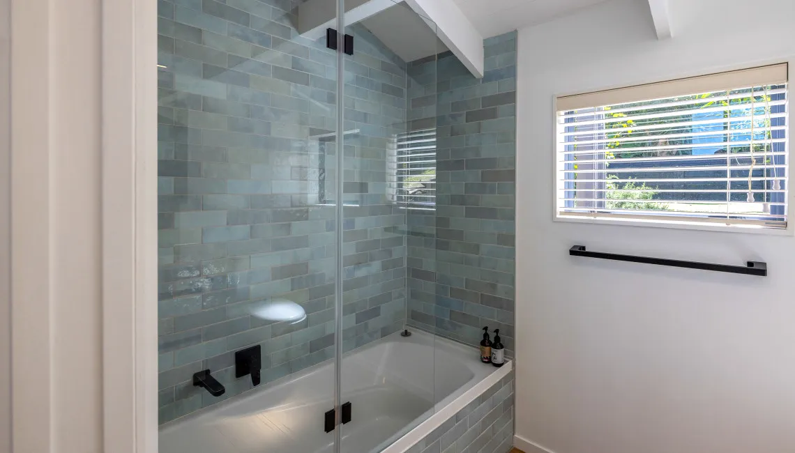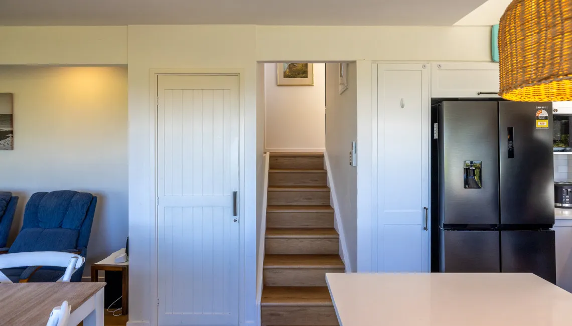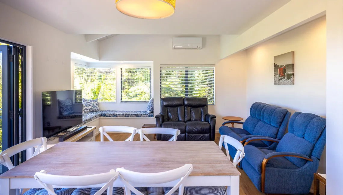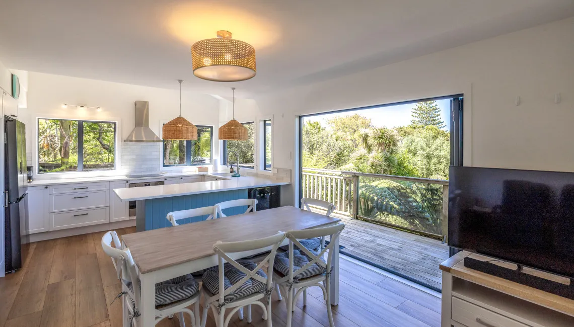 Downstairs, the guest bedroom and family bathroom offer comfort and space for additional guests. The bathroom includes a full bathtub — a rare luxury on Waiheke — ideal for soaking after a day at the beach. The open-plan living and dining area is bright and airy, with large windows and a ranch slider opening to the front deck. Natural light pours in, and the sea view remains a constant presence.