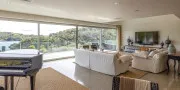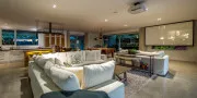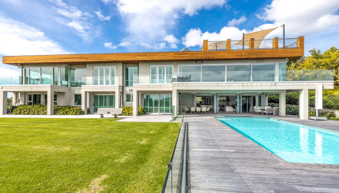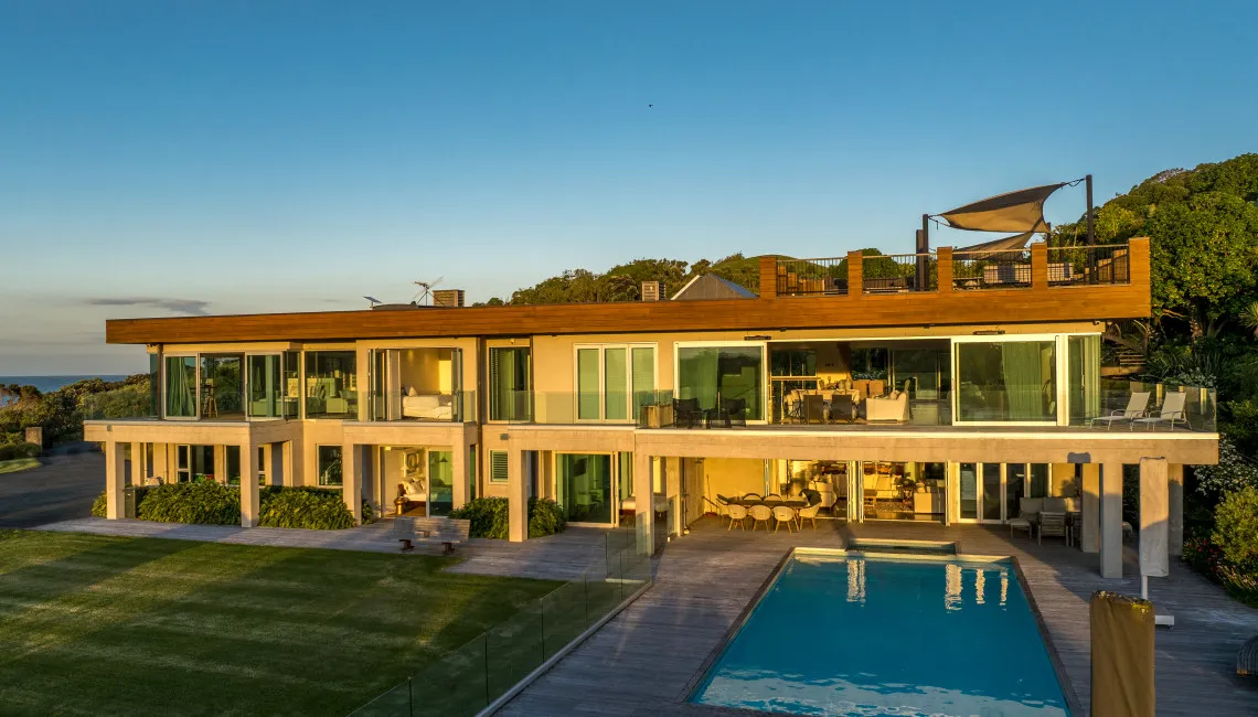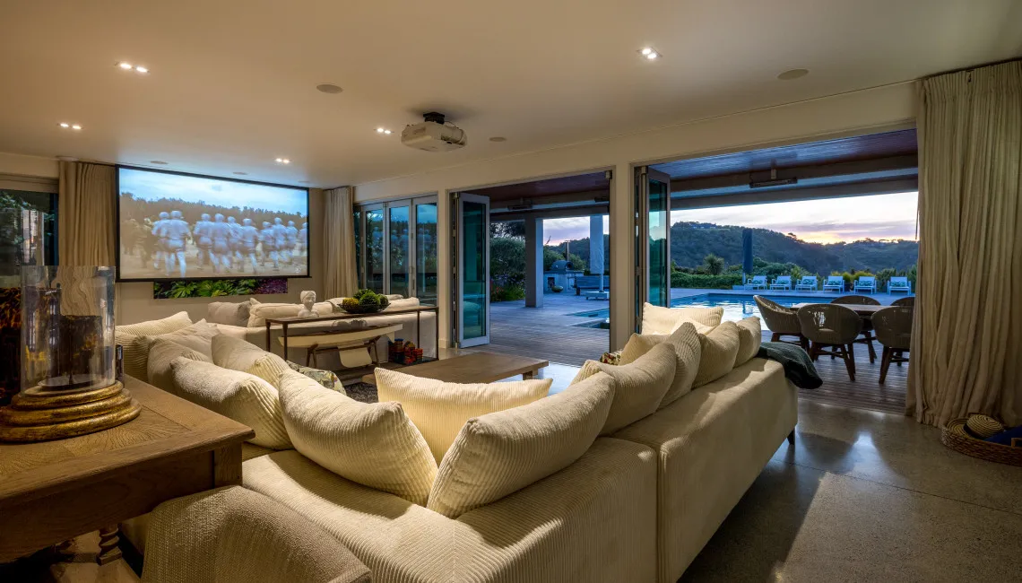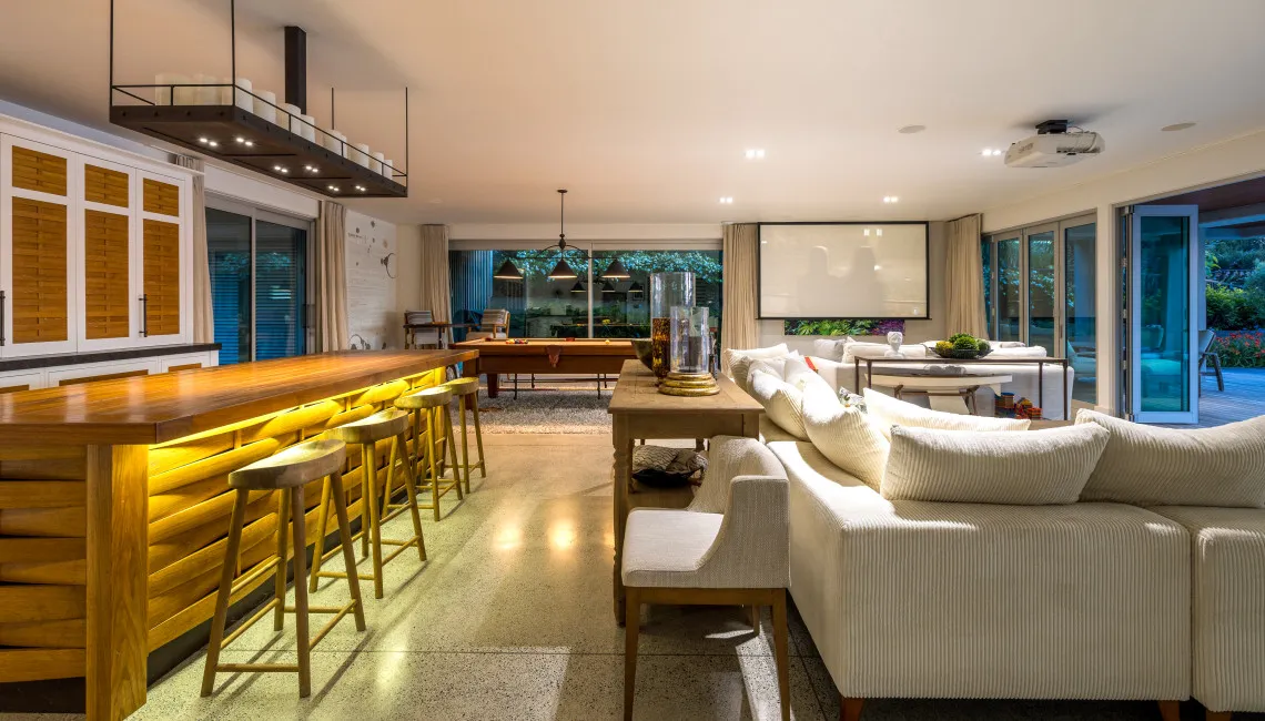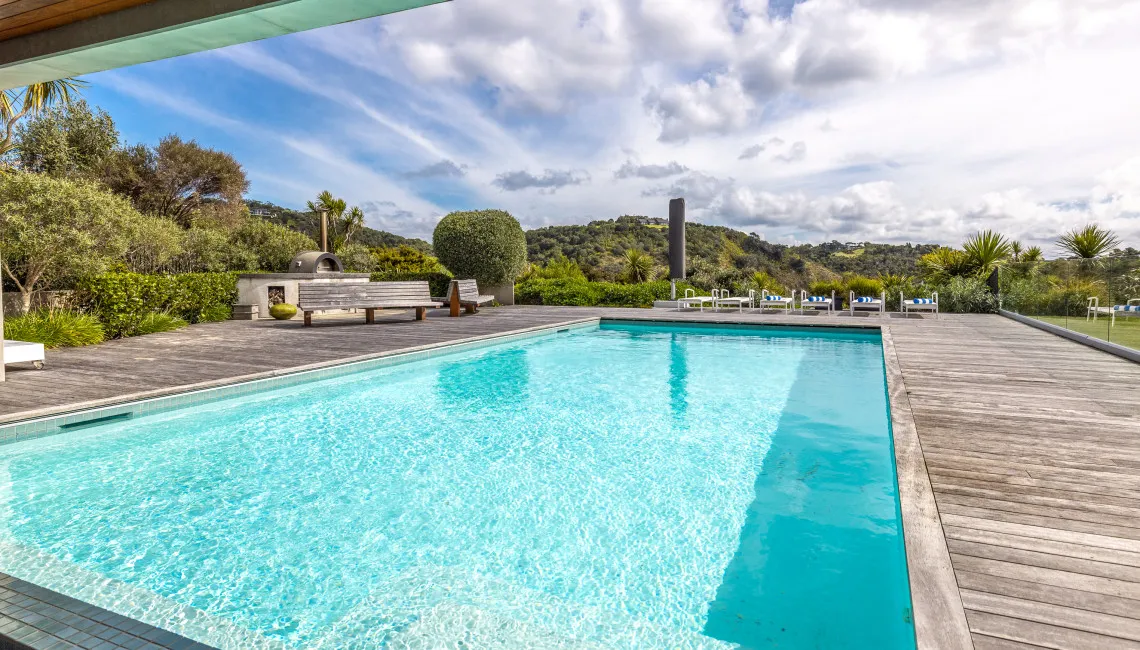 There are two large living areas – one with a grand piano, high-quality artwork and ocean outlook, and another dedicated to recreation with a pool table, cinema screen and fully equipped bar. The downstairs lounge opens directly onto the pool area, creating a seamless connection between indoor and outdoor living. Here you’ll find a wood-fired pizza oven, generous sunlounging space and a large lawn perfect for games or relaxing in the sun.