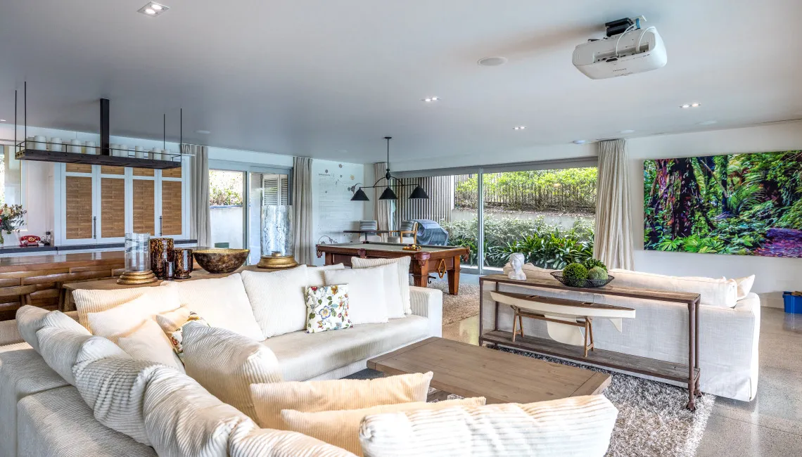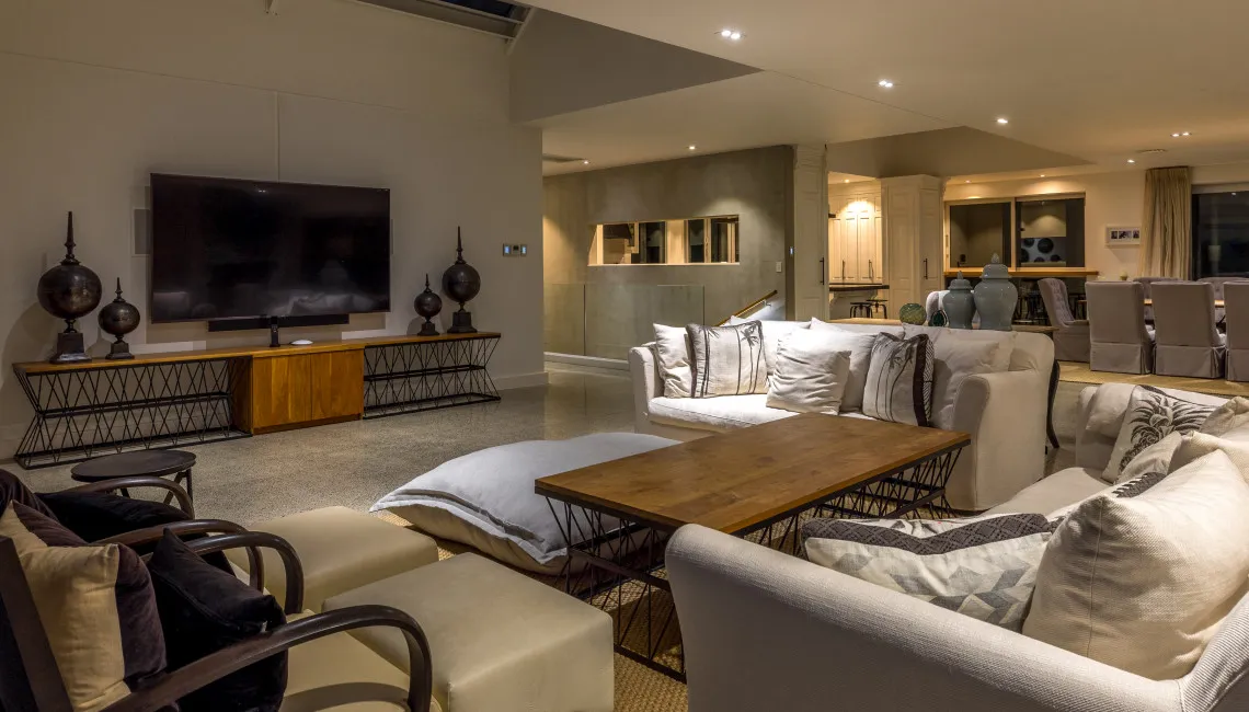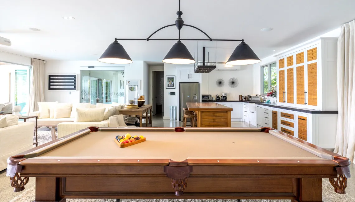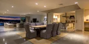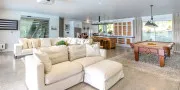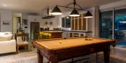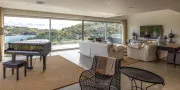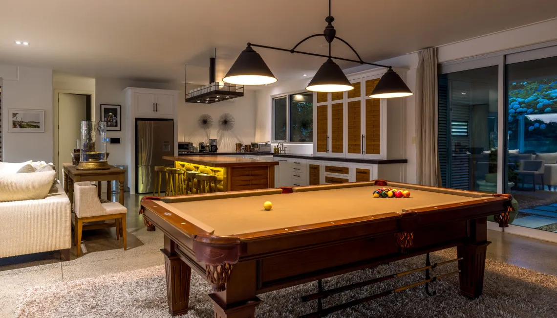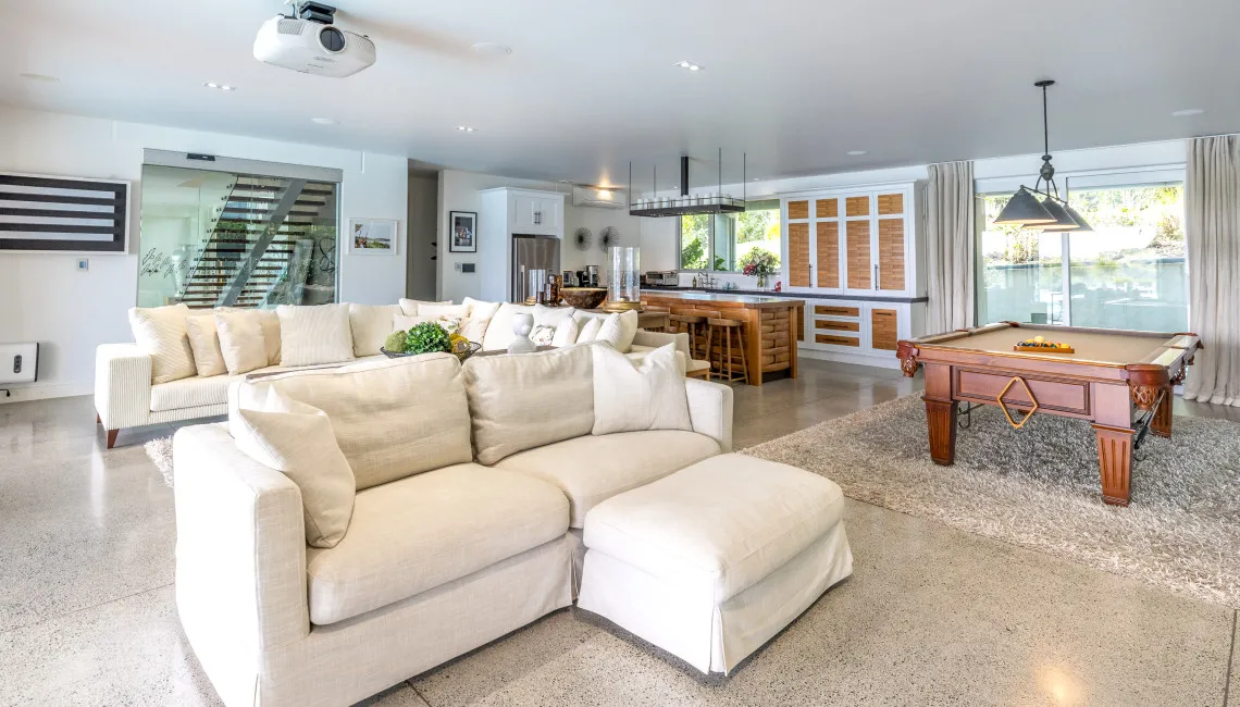 There are two large living areas – one with a grand piano, high-quality artwork and ocean outlook, and another dedicated to recreation with a pool table, cinema screen and fully equipped bar. The downstairs lounge opens directly onto the pool area, creating a seamless connection between indoor and outdoor living. Here you’ll find a wood-fired pizza oven, generous sunlounging space and a large lawn perfect for games or relaxing in the sun.
