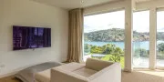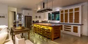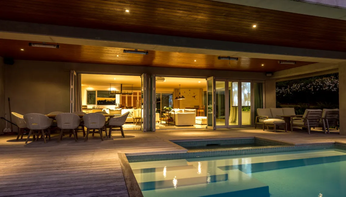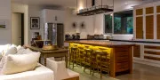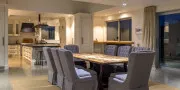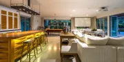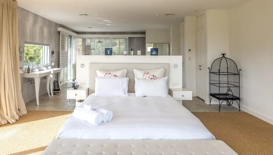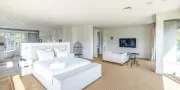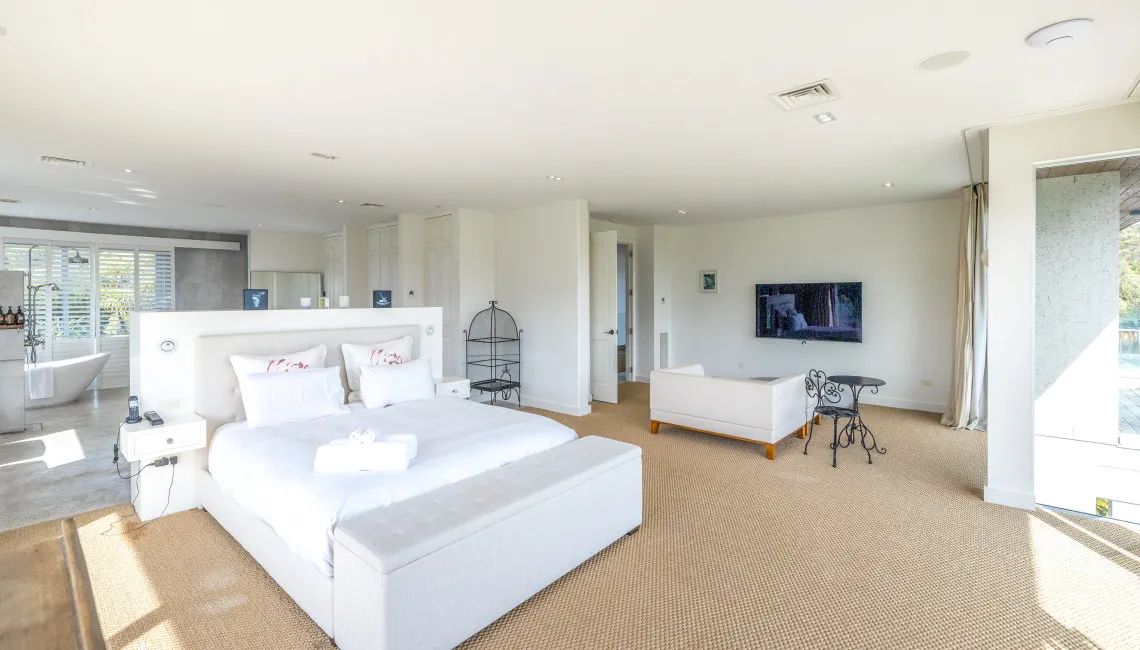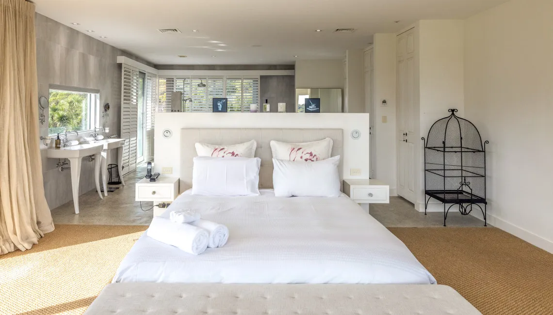 The home features four spacious king bedrooms, each with its own ensuite and finished to a high standard. Two guest suites are located on the ground floor, while the master suite and an additional guest suite occupy the upper level. The master suite is an enormous open-plan sanctuary with a luxurious shower, bathtub with ocean views, and a large dressing area, creating a true sense of indulgence. A fifth bedroom with twin single beds is available by special request for children.