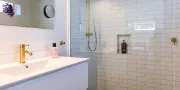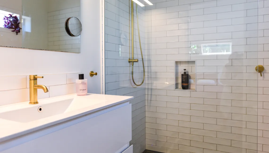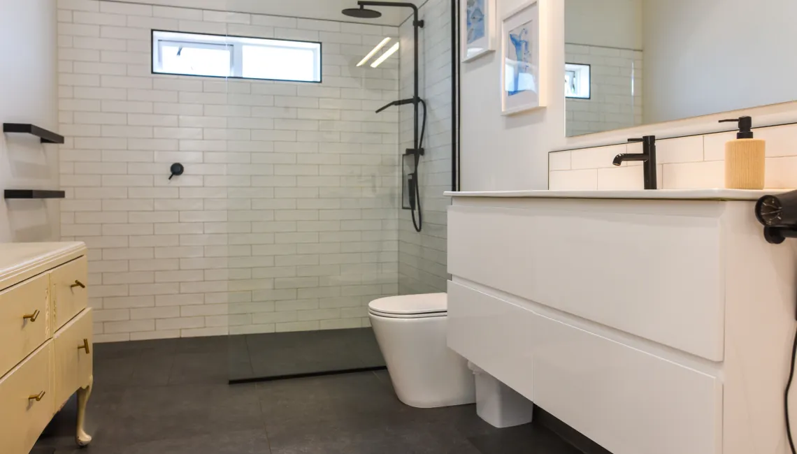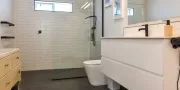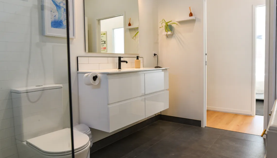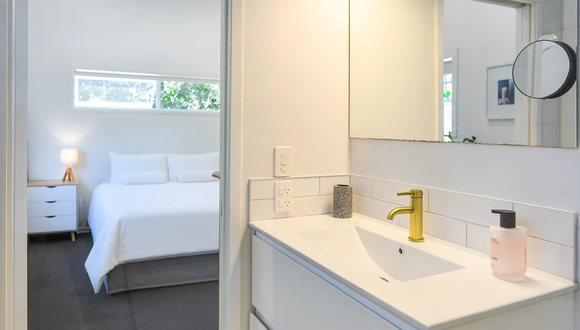 The main house offers three generously sized bedrooms (1 x king, 2 x queen), including a master with its own tiled ensuite. A second family bathroom, also tiled and fitted to a high standard, serves the remaining bedrooms. Adding flexibility, a stand-alone sleepout in the pool area provides a fourth bedroom with a king bed and its own modern bathroom — ideal for guests seeking extra privacy or space.