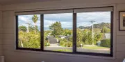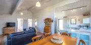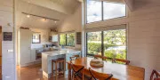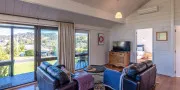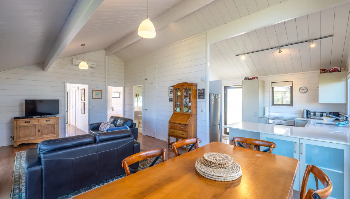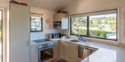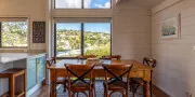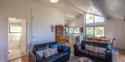 The open-plan living, dining, and kitchen area is bright, spacious, and inviting — with large windows framing the view and a seamless flow to the front deck. A heat pump/air conditioning unit keeps the space cool in summer and cosy in winter, ensuring comfort year-round.