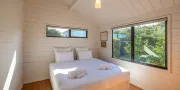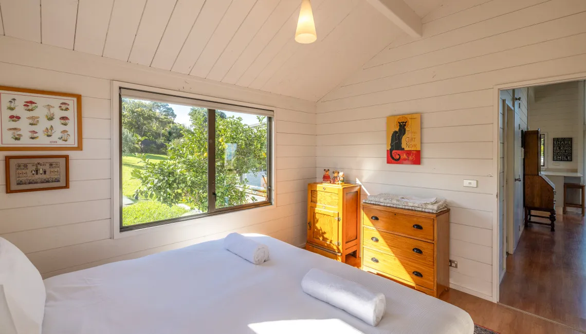 Sleeping up to four guests, the cottage offers one queen bedroom and a second room with a split king that can be set up as twin singles or a king, depending on your needs. The bathroom is fresh and functional, and all rooms are outfitted with luxury linens for a restful stay.