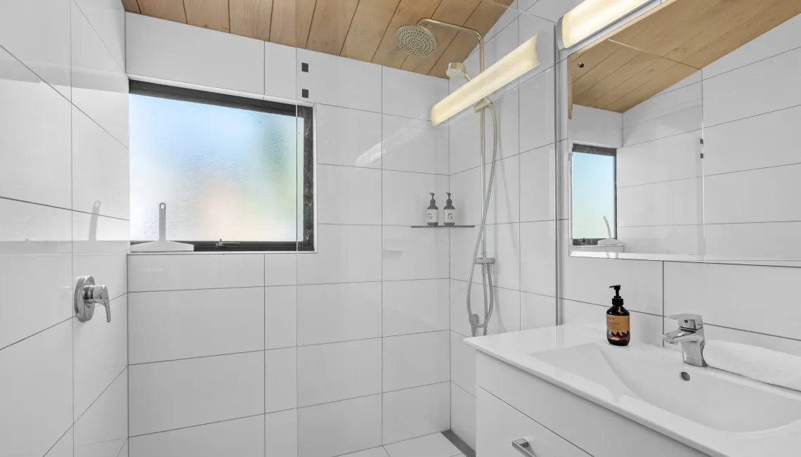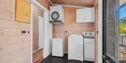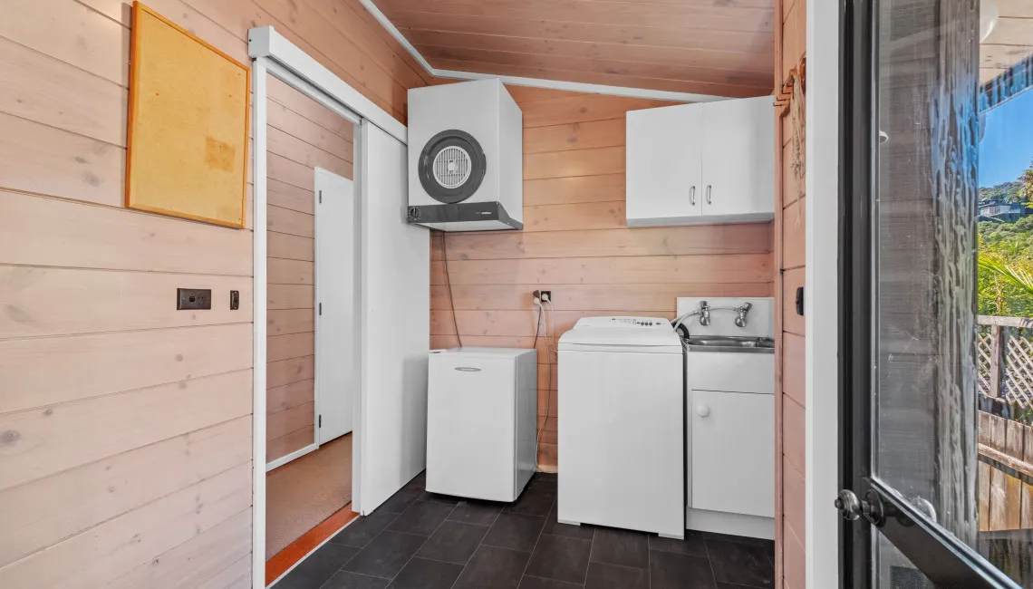 The newly installed family bathroom has a large, fully tiled shower with rain head and there is a separate toilet area. A laundry space with washing machine, dryer and additional bar fridge is also provided.