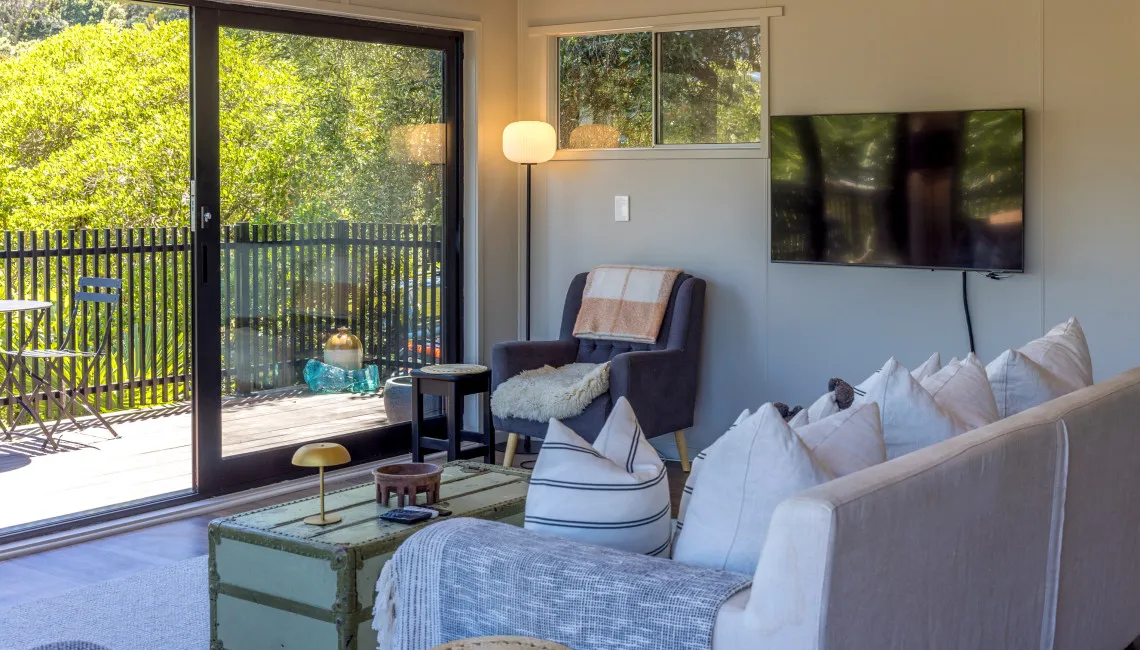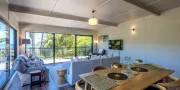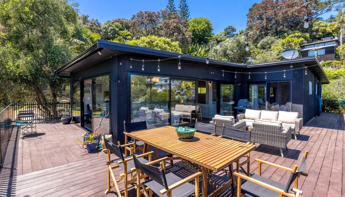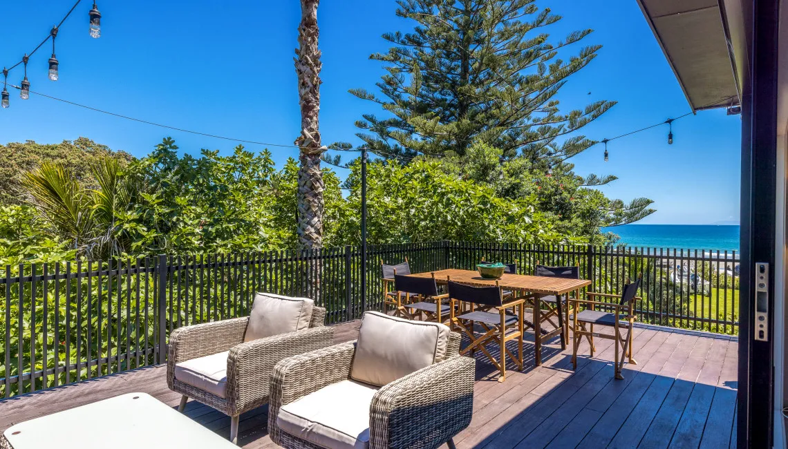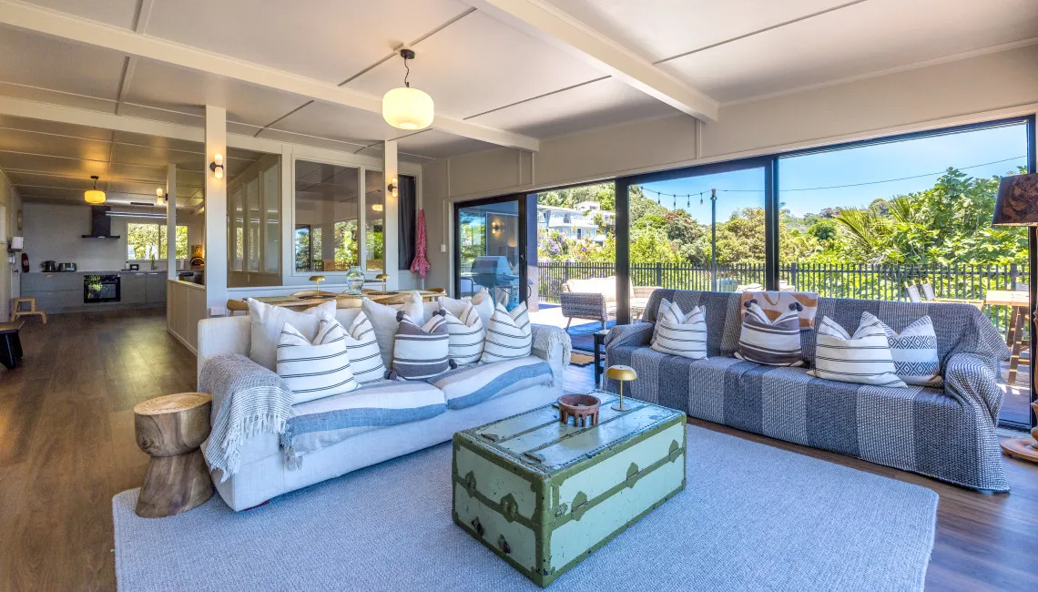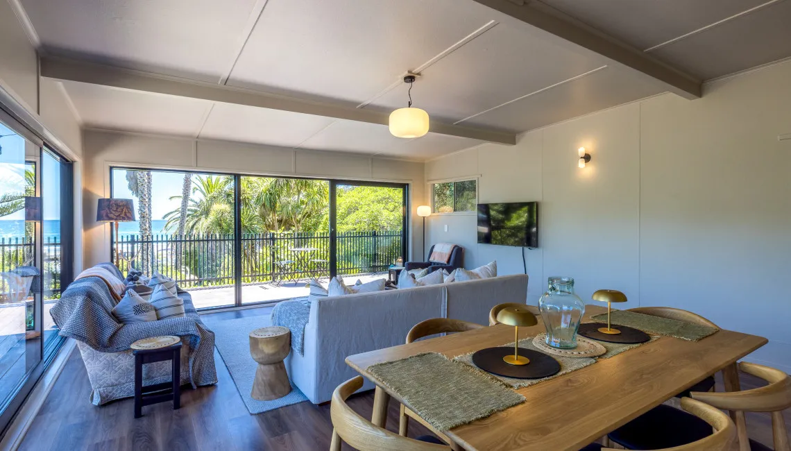 The house has a relaxed, coastal feel with a clean, modern finish throughout. The open plan living, dining, and kitchen area is light and comfortable, with large sliding doors opening onto a generous deck that looks out across the bay. This space works beautifully for everyday living, whether you are inside with the doors open or spending most of your time outside on the deck.