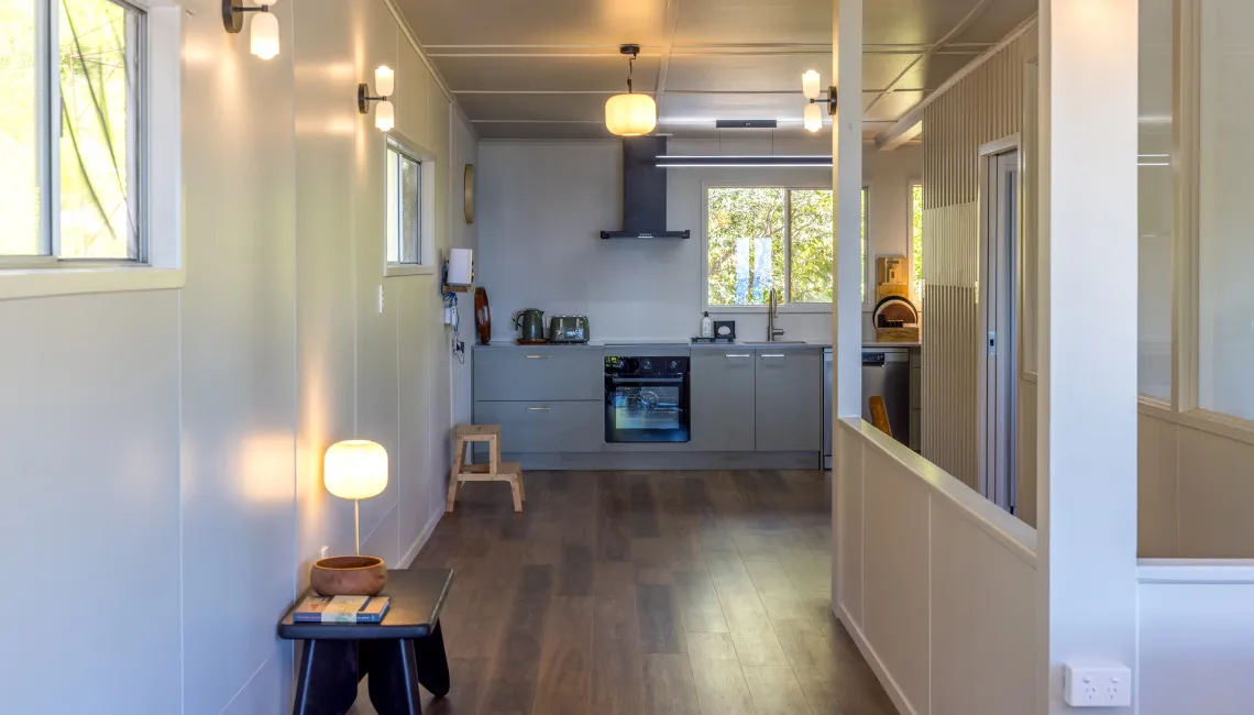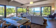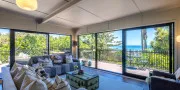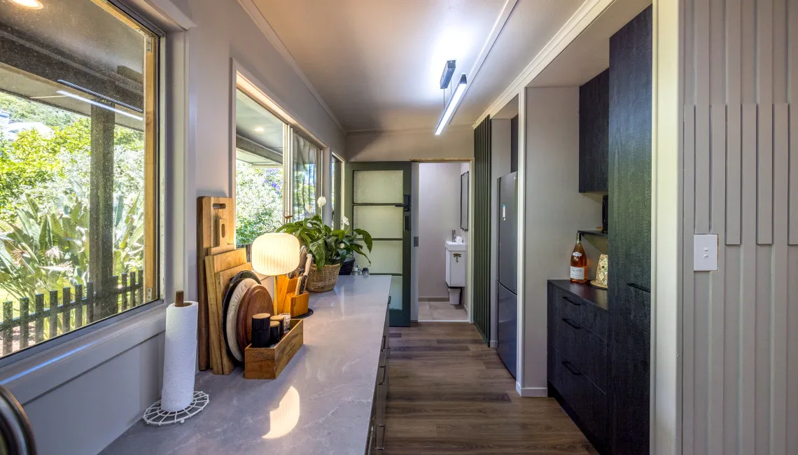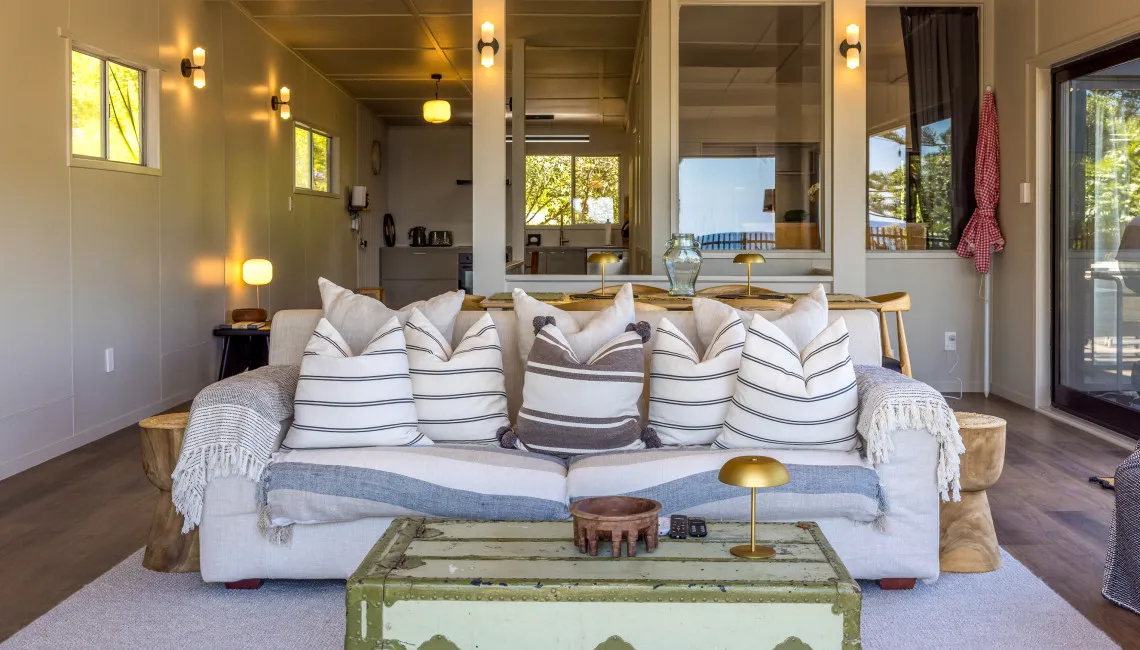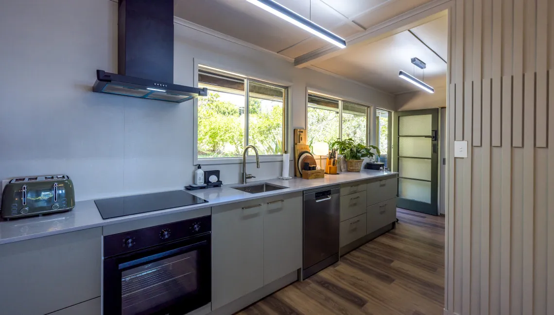 The house has a relaxed, coastal feel with a clean, modern finish throughout. The open plan living, dining, and kitchen area is light and comfortable, with large sliding doors opening onto a generous deck that looks out across the bay. This space works beautifully for everyday living, whether you are inside with the doors open or spending most of your time outside on the deck.