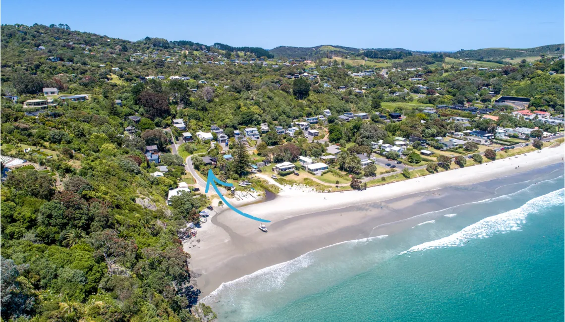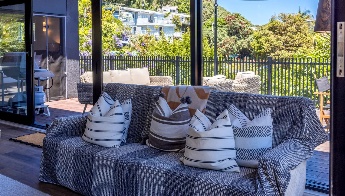 Moana Beach House sits directly on the sand at Onetangi Beach, with a flat lawn that allows you to walk straight from the house onto the beach. This kind of true walk on beachfront access is rare on Waiheke Island and is what makes this location so special.