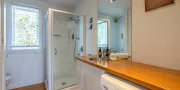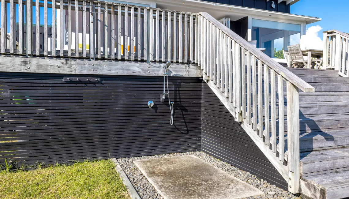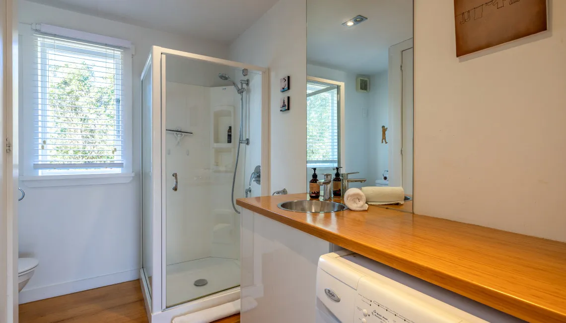 The shared family bathroom is complete with toilet, shower and wash basin and is clean and modern, the bathroom also features a washing machine for in-house laundry. Fluffy white towels, facecloths and premium toiletries are included for every guest. There is also a warm-water outdoor shower, giving you an extra shower option and a spot to wash off after a day at the beach.