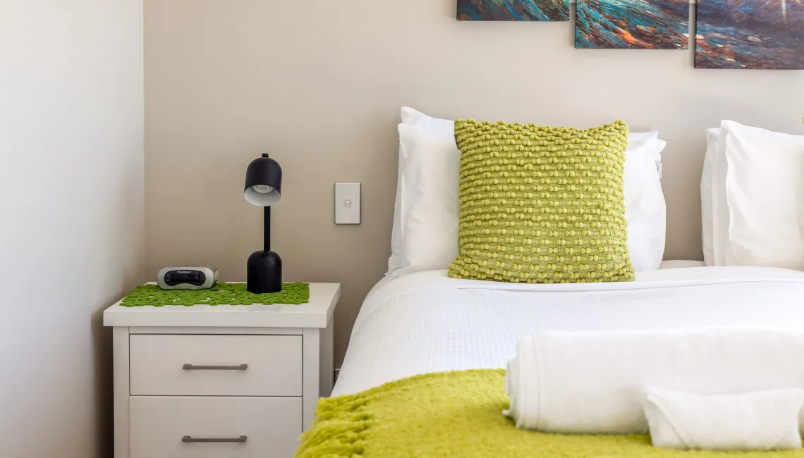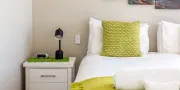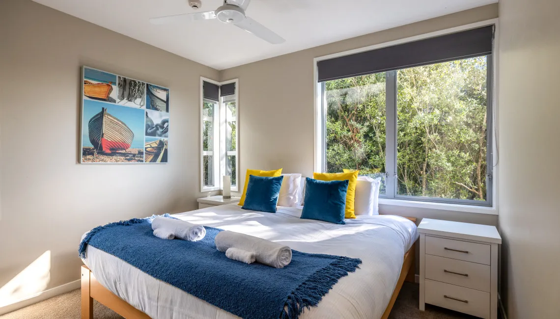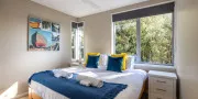 Bedroom 1 has a queen bed and Bedroom 2 has a split king which is normally setup as a king, but can be made into two singles on request.