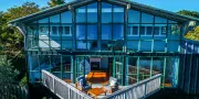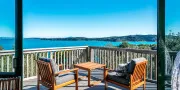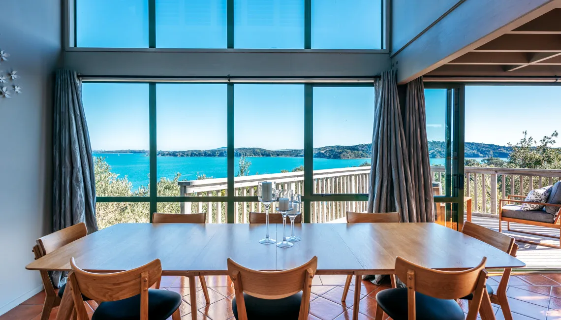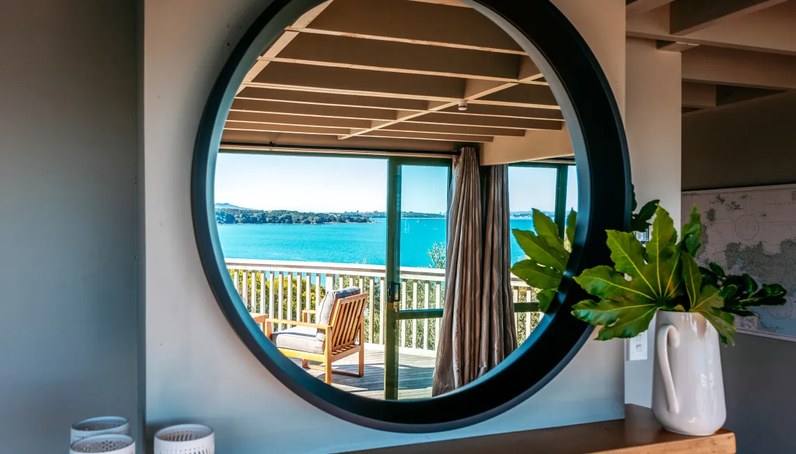 Spinnaker Watch is a light-filled, two-storey holiday home set high above the water, offering sweeping views across the bay to Auckland City. The outlook is ever-changing — ferries gliding across the harbour by day and the city lights twinkling on the horizon by night. It’s a peaceful and private spot, yet conveniently close to the Kennedy Point Ferry, Palm Beach, and Oneroa Village.