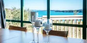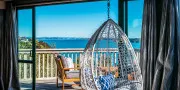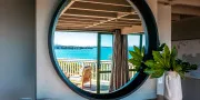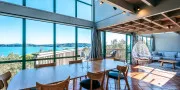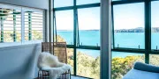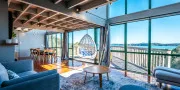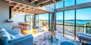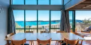Inside, the home feels calm and spacious. The open-plan living, dining, and kitchen area extends to a wide front deck where you can take in the view, enjoy long lunches in the sun, or simply sit back and watch the tide roll in. Furnished in natural tones with soft linen and light timbers, the space has an understated, relaxed feel. The wall of glass at the front of the house maximises enjoyment of the view from every room in the house.