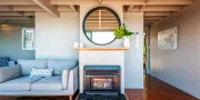 The large downstairs lounge offers plenty of room to unwind, with comfortable seating, a heat pump, and a wood fire for cooler months. At the rear of the home, a sheltered courtyard provides a second outdoor space complete with BBQ and dining area — ideal for evening meals or for families wanting a safe, enclosed area for children.