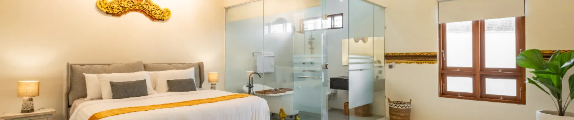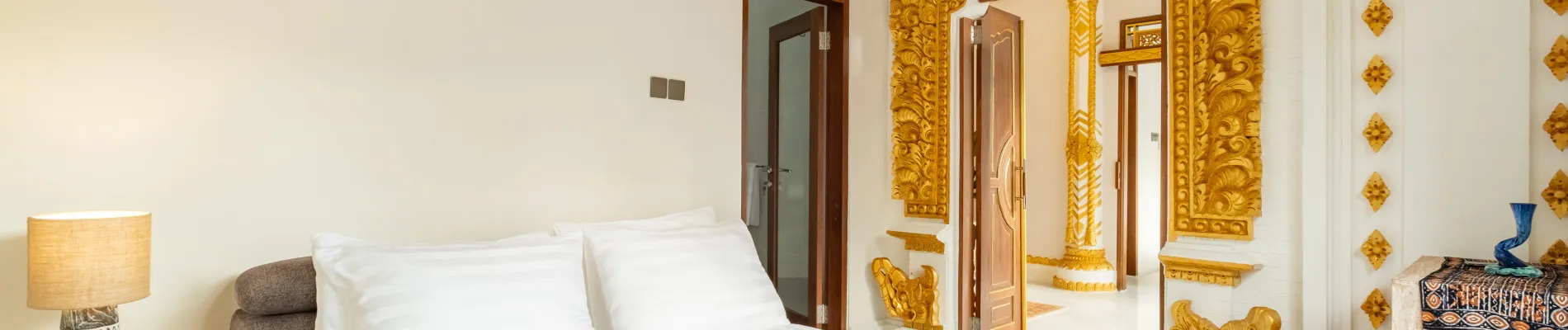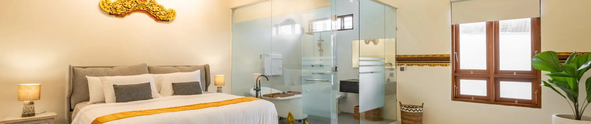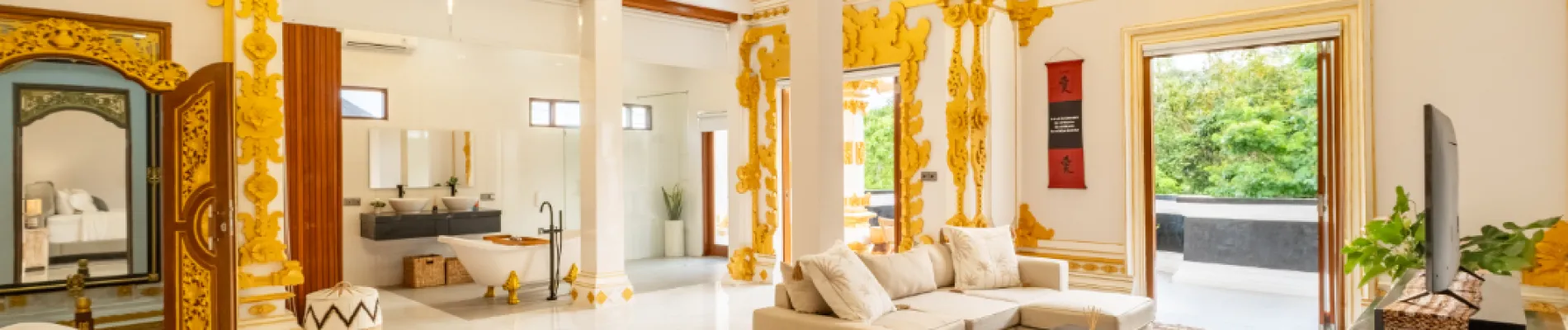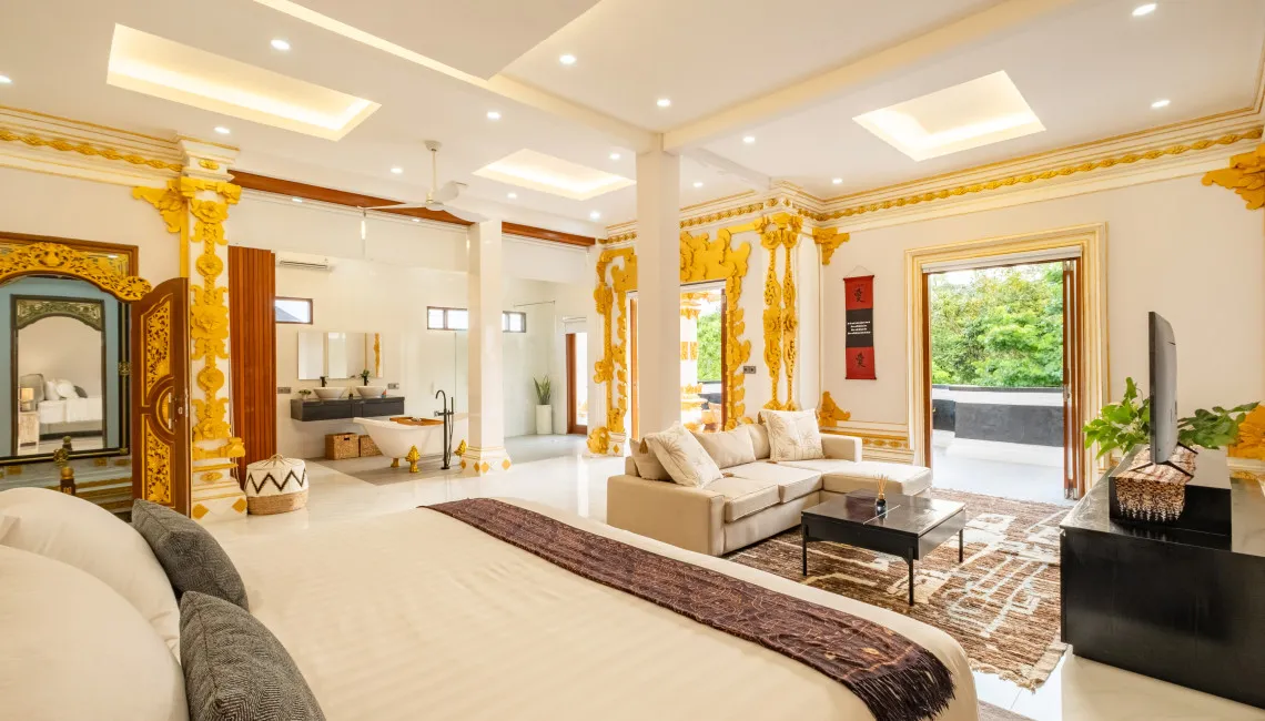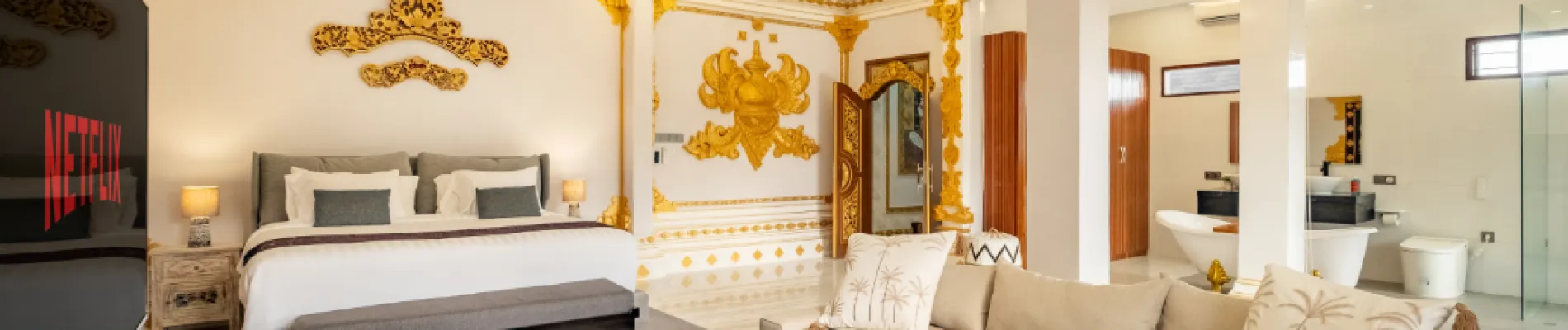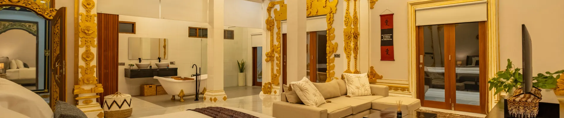 At 90 sqm this Master Suite features a very comfy Super King sized designer bed, an expansive open plan design, a freestanding claw-foot bathtub, and a serene lounge area that flows out through wooden steps and carved wooden doors to an exquisite traditional Balinese Lounging Pavillion. This outdoor retreat, with its inticate gold and white detailing is perfect for unwinding amidst gentle warm breezes and temple - like serenity.