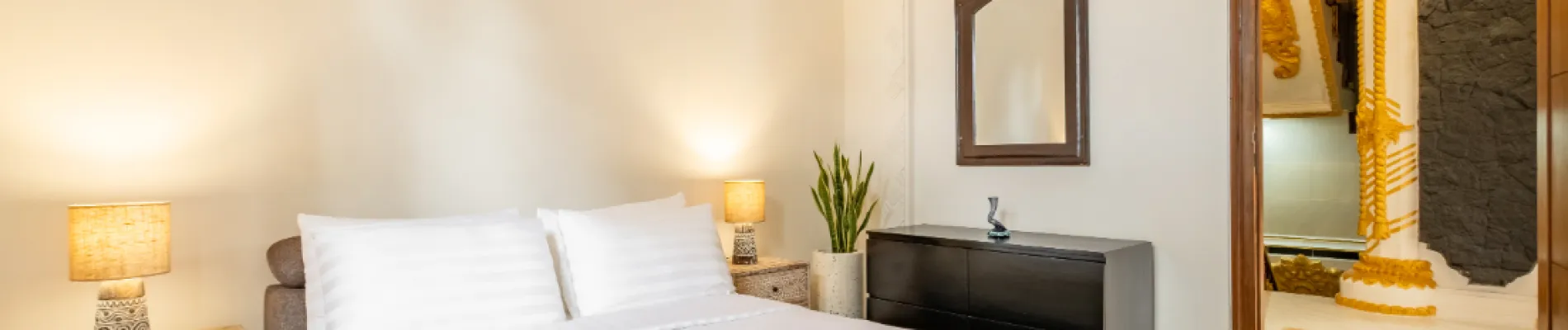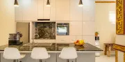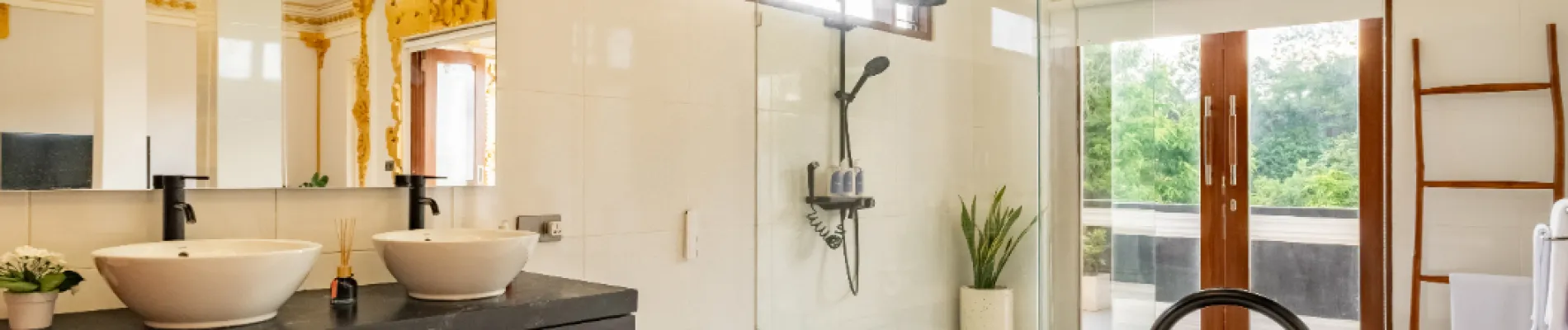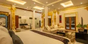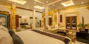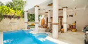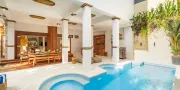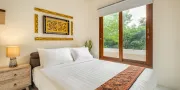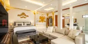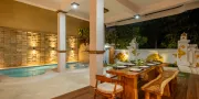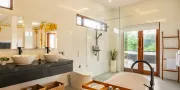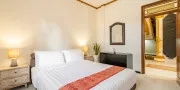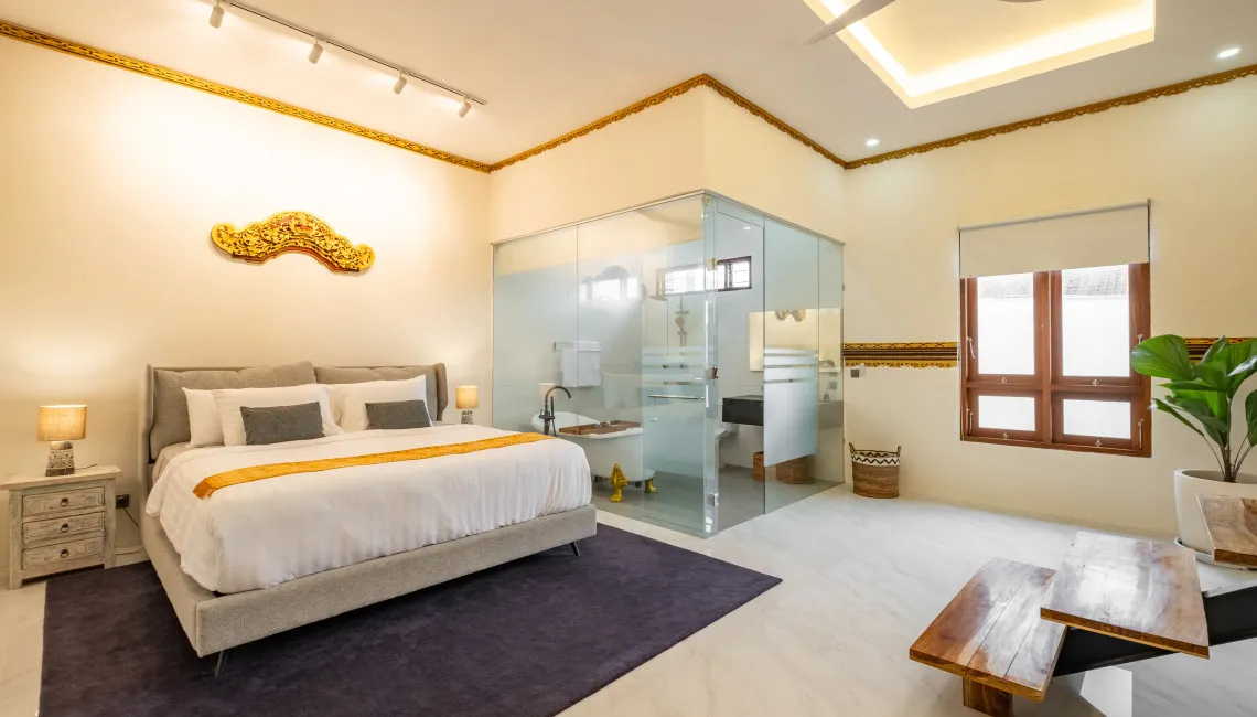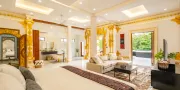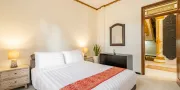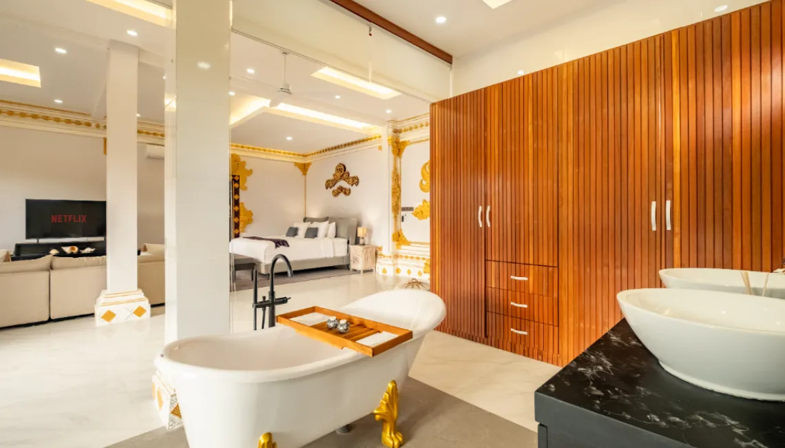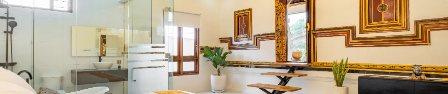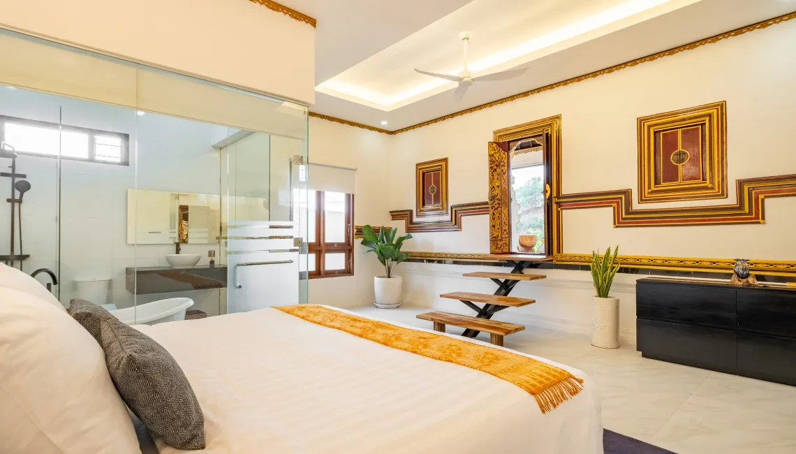 At 90 sqm this Master Suite features a very comfy Super King sized designer bed, an expansive open plan design, a freestanding claw-foot bathtub, and a serene lounge area that flows out through wooden steps and carved wooden doors to an exquisite traditional Balinese Lounging Pavillion. This outdoor retreat, with its inticate gold and white detailing is perfect for unwinding amidst gentle warm breezes and temple - like serenity.