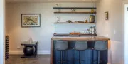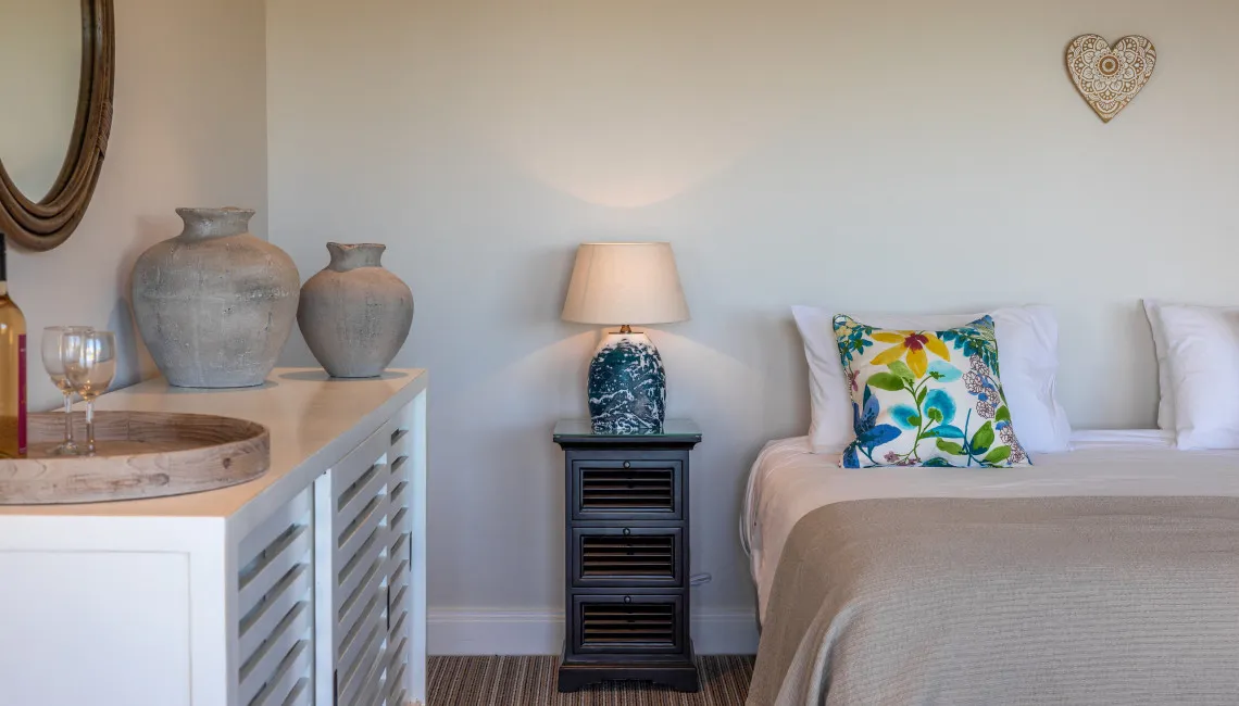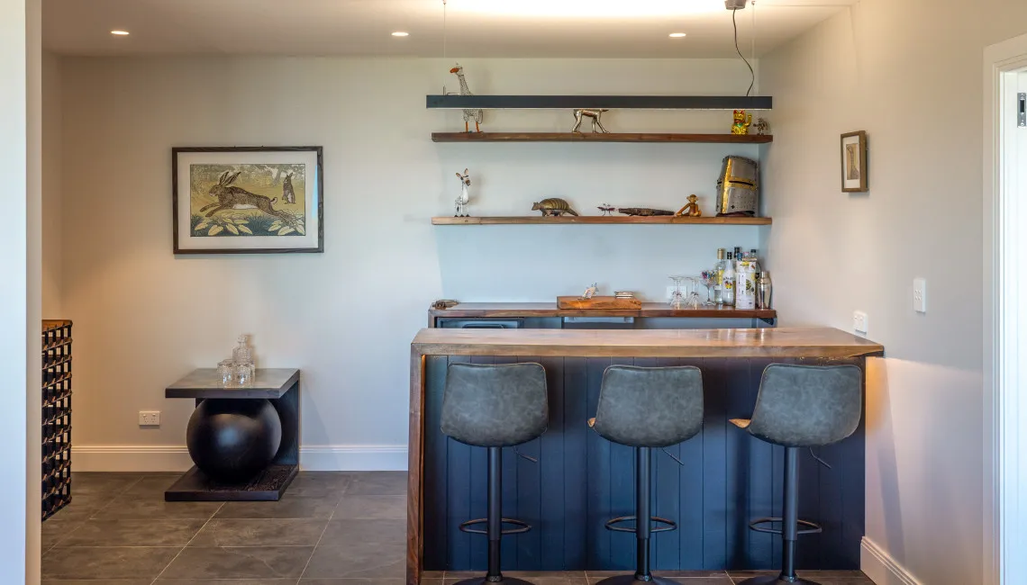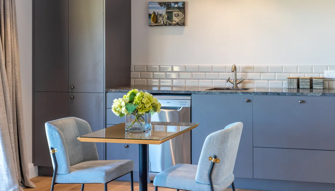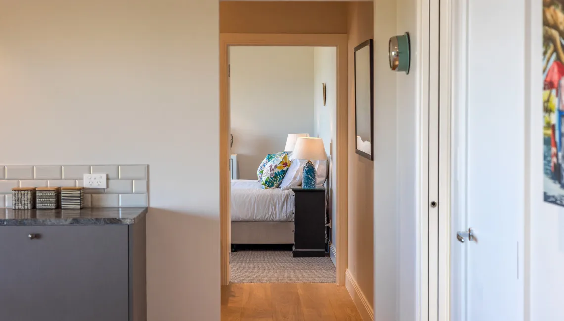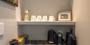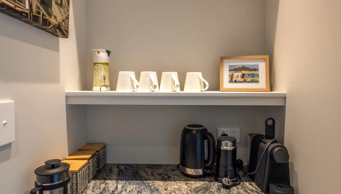 The central bar area offers a relaxed place to mix cocktails and entertain, making it ideal for evenings in. The compact kitchenette includes crockery, cutlery, plenty of wine glasses, tea and coffee, a dishwasher and a portable induction hob for simple meals. A gas BBQ sits on the deck for effortless outdoor cooking. We supply luxury linens, high-quality teas and coffees, and premium toiletries as a starter pack to make your stay comfortable from the moment you arrive.