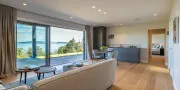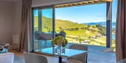 Expansive sliding glass doors at the front of the living space open to the deck and bring in wide views of the valley, bay and ocean — an easy place to enjoy breakfast in the sun or a quiet drink at dusk.