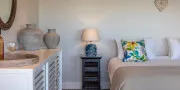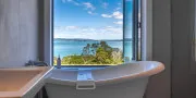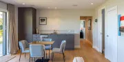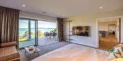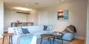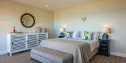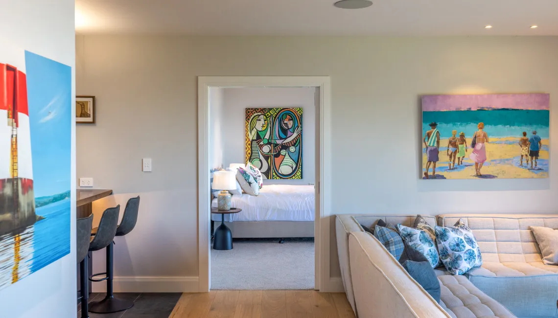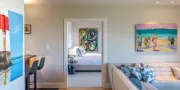 Inside, the apartment is arranged with two king bedrooms located at opposite ends, separated by a spacious open-plan living, kitchen and bar area. Each bedroom has a king bed and Smart TV (with Netflix and Apple TV ready to go). The bathroom includes a deep soaking tub positioned to take in the views — a calm place to unwind after a day exploring the island. High-speed internet is available throughout.