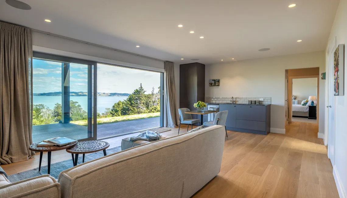 The Keep is well located for coastal walks through Whakanewha Regional Park and for exploring nearby quiet beaches. Ostend is around seven minutes’ drive, with Oneroa and Onetangi only a few minutes further.