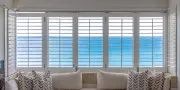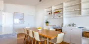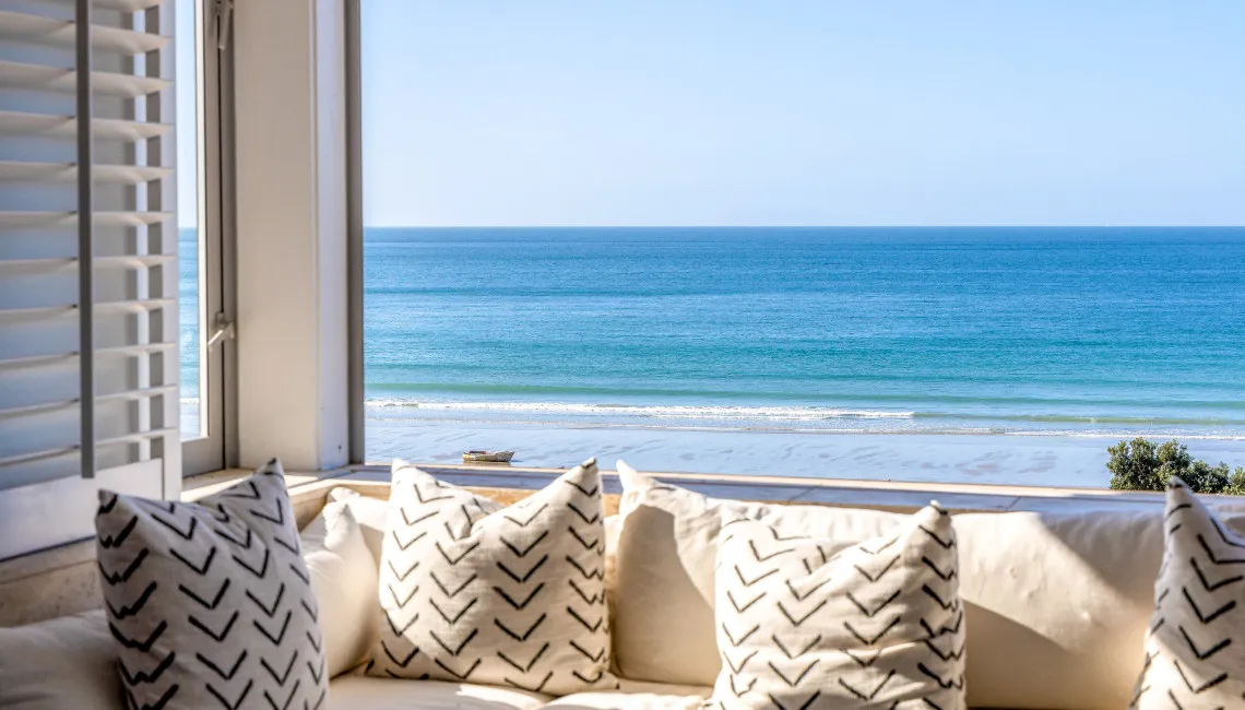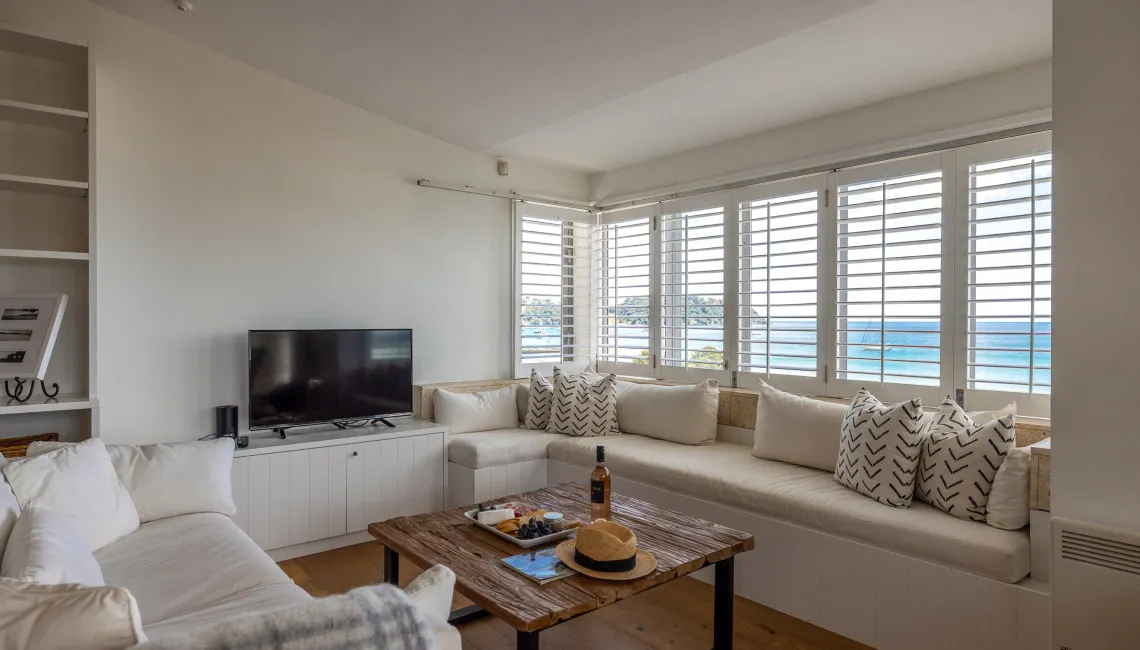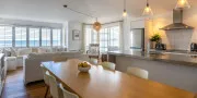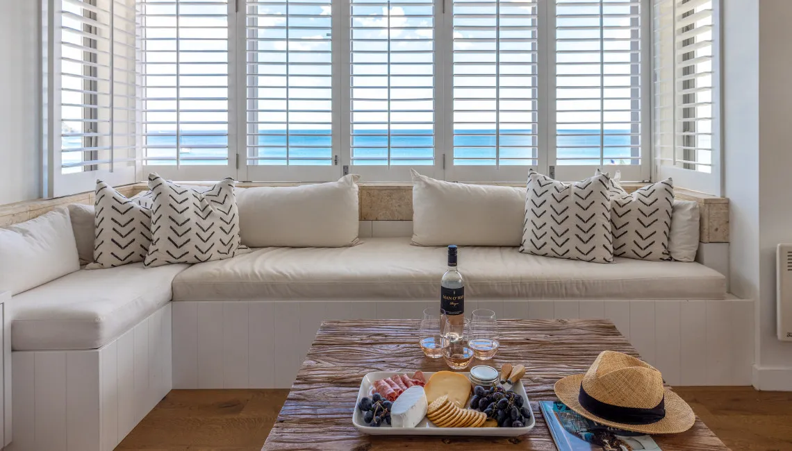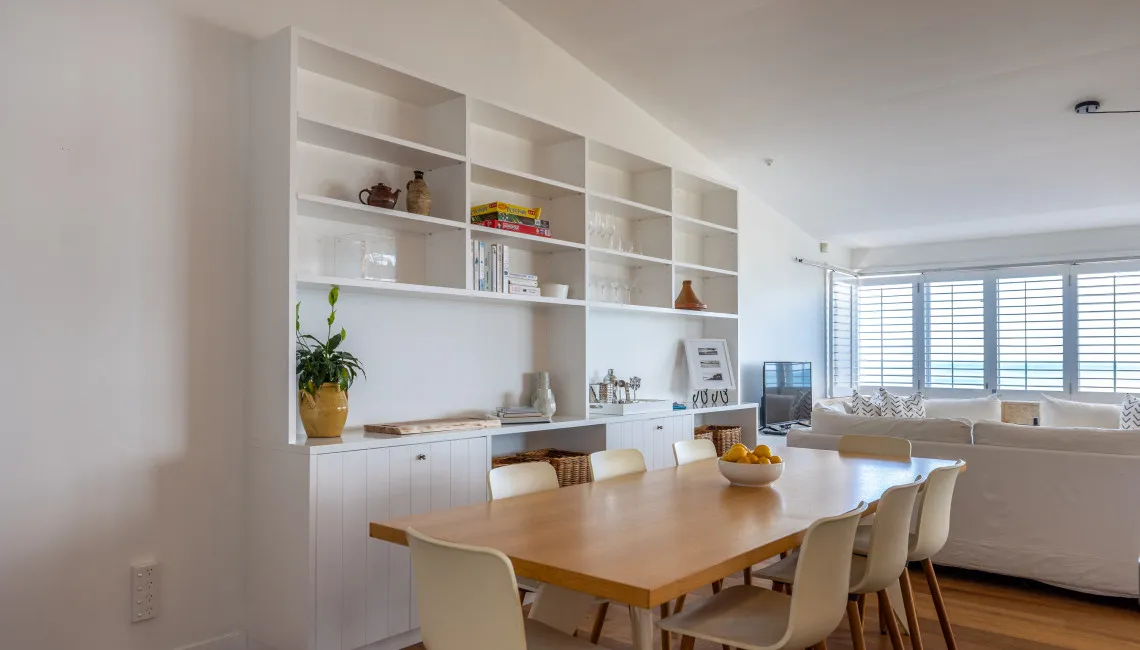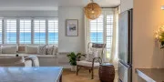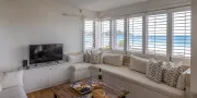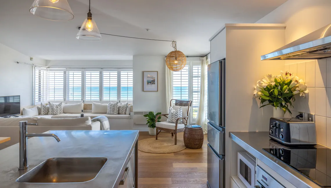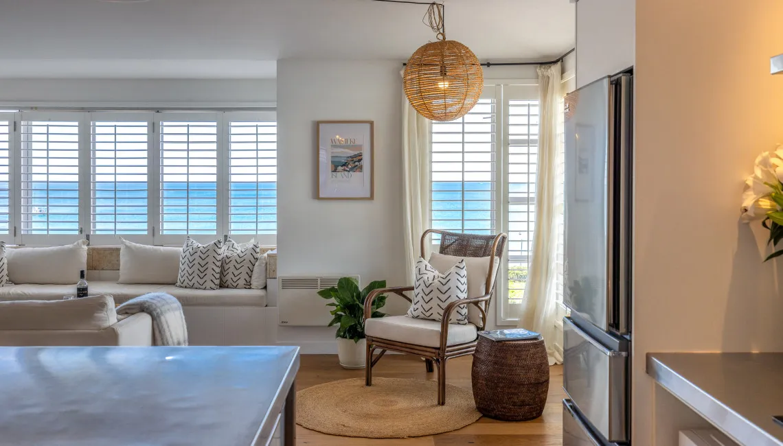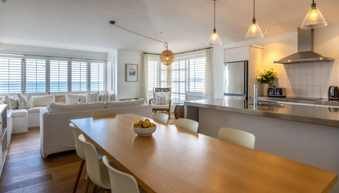 The open-plan living, dining, and kitchen area sits at the front of the apartment, making the most of the outlook. Large windows with plantation shutters frame the sea views and fill the space with natural light throughout the day. The living area is comfortably furnished for laid-back beachside living and includes TV and Wi-Fi, while the full kitchen is equipped for easy meals at home.