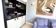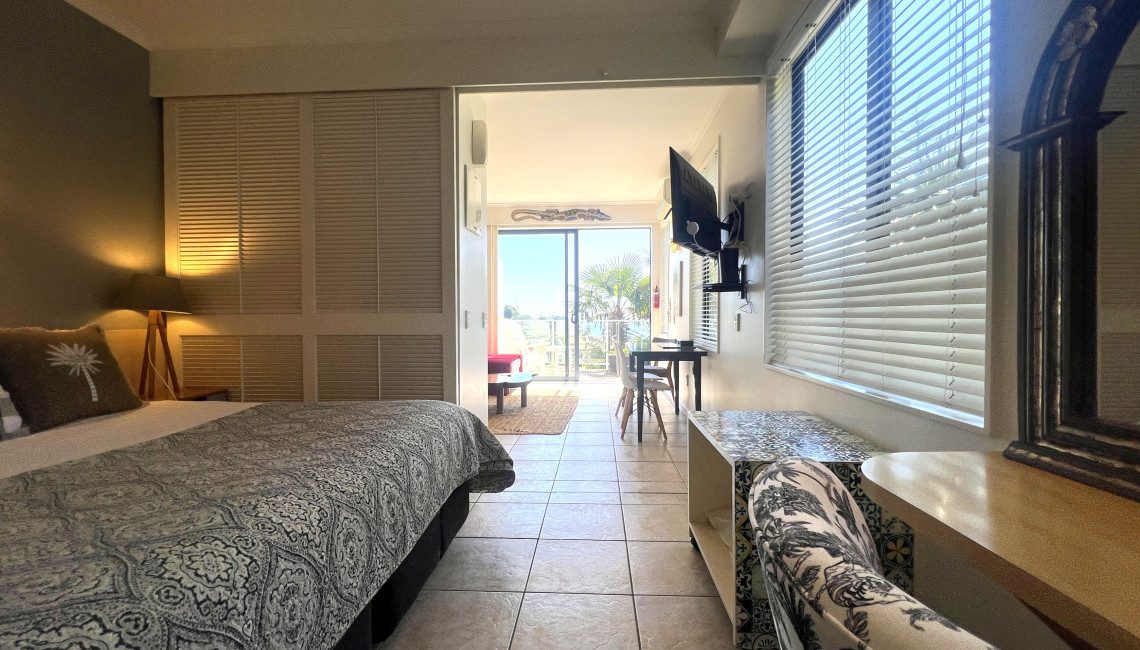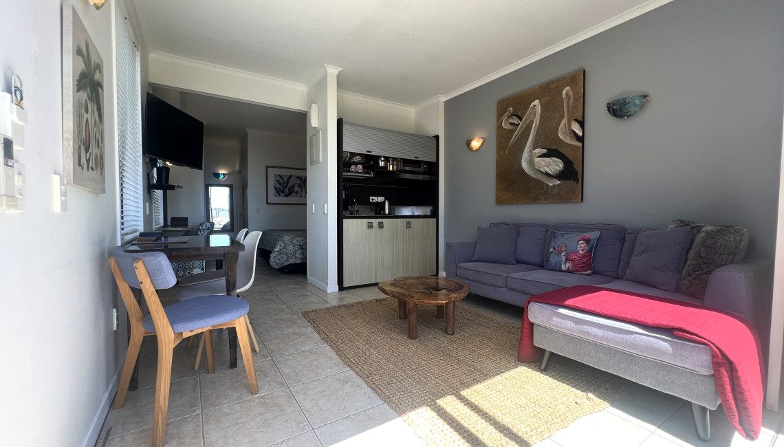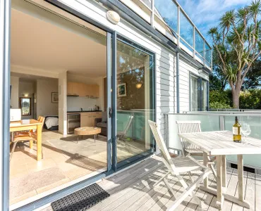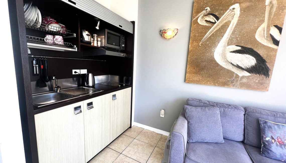 The open-plan layout flows from a super-king bed dressed in crisp linen through to a living area with Smart TV (Netflix & Sky Sports) and a fully equipped Italian-made kitchenette complete with fridge, microwave, and toaster. Large windows and double glazing frame the view while keeping the apartment quiet and comfortable. Air-conditioning, a heat pump, and Wi-Fi ensure all the modern conveniences are at hand.