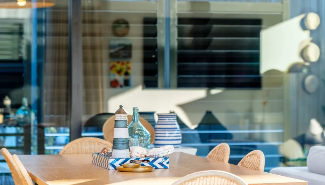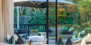 The entire house opens up in summer, with sliding doors on both sides and sun screens giving the house great ventilation and protection from the elements. There is also air conditioning in the main living area