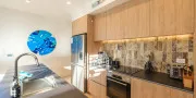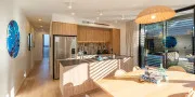 The large kitchen island makes this a great communal space to hang out and enjoy a glass of wine with friends, or to grab a quick breakfast before heading to the beach.