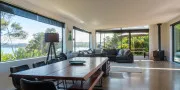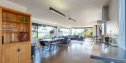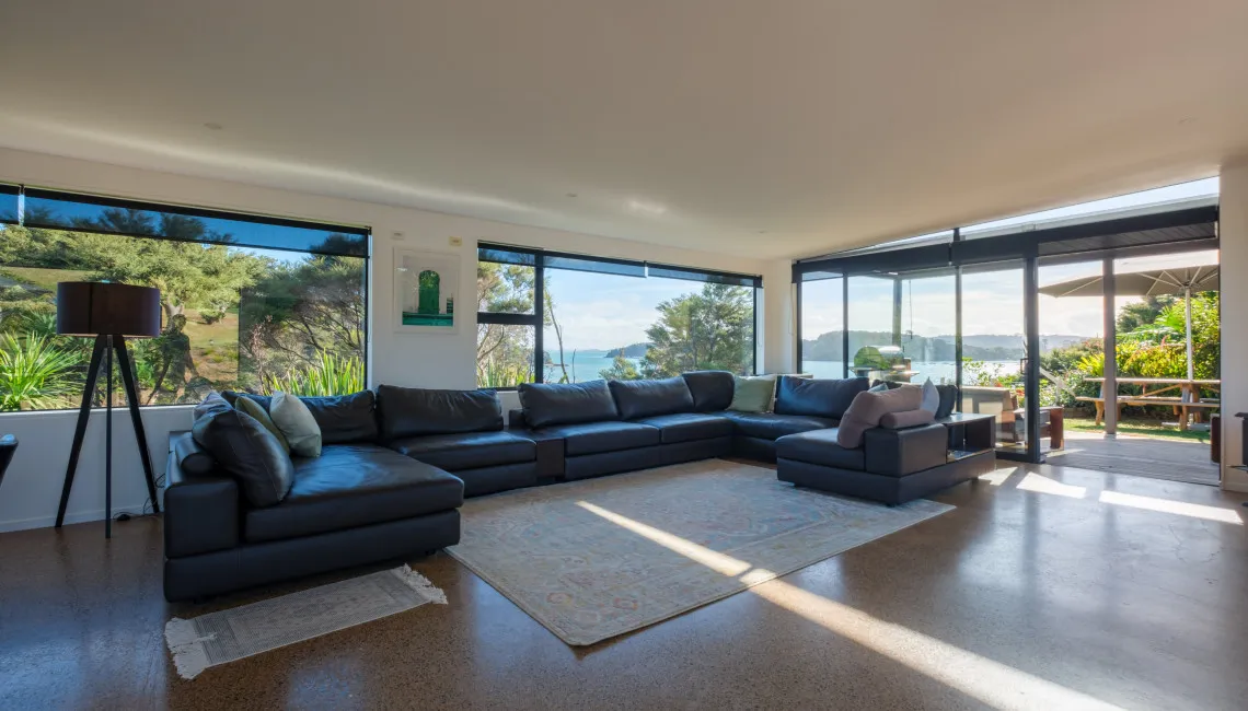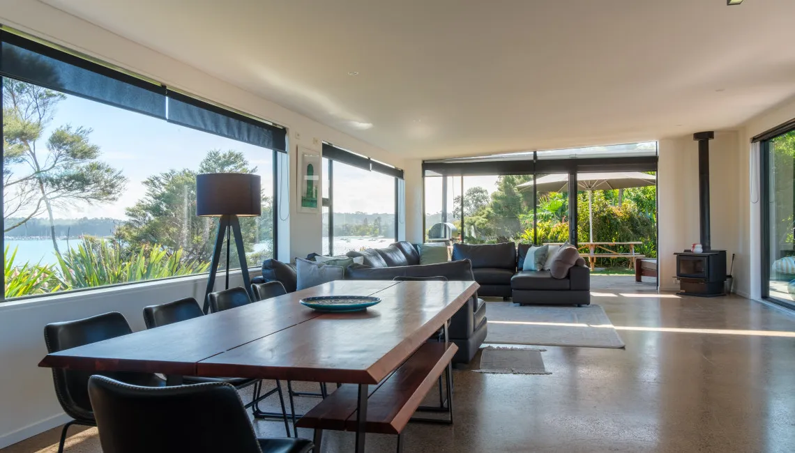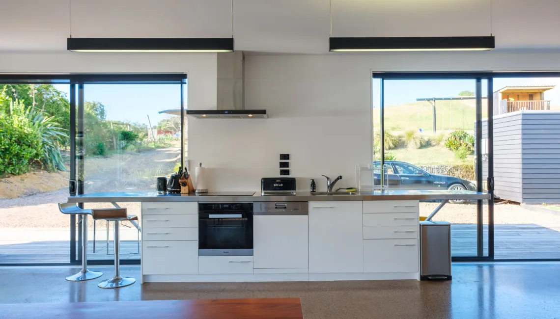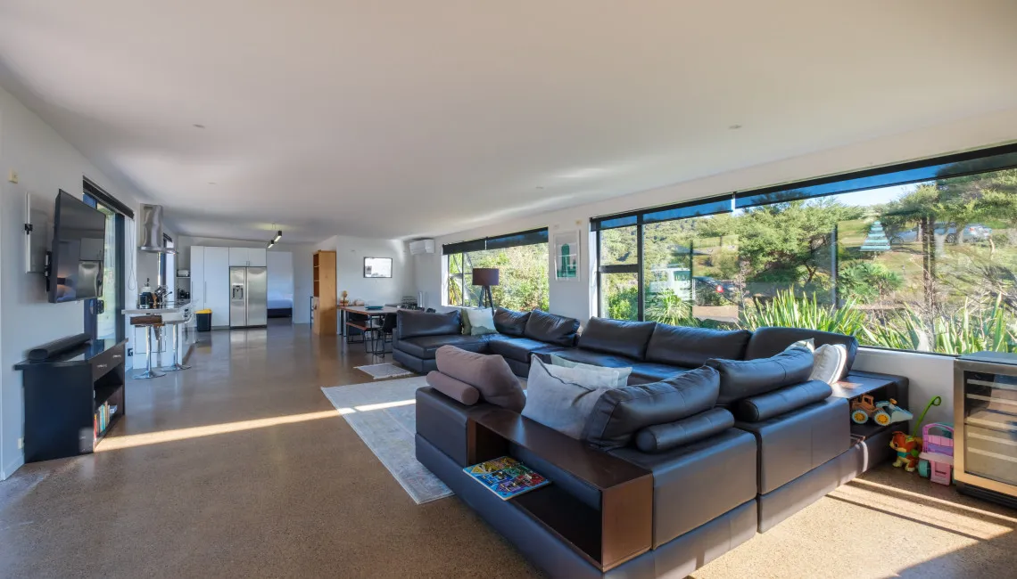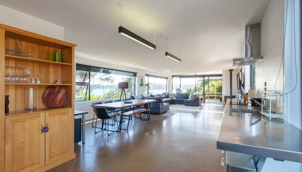 The main house is a huge open plan space, with polished concrete floors, fully featured kitchen, with a separate dining area, comfortable lounge space and extensive outdoor grounds with dining spots, lounging spots and gardens to explore.