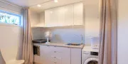 The kitchen is fully stocked with pots, pans, cutlery, plates and serving dishes. It features a large fridge/freezer with filtered water dispenser and ice maker. There is a dishwasher, induction hob, full size oven, microwave and coffee machine.