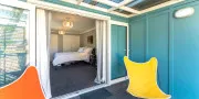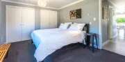 The master bedroom has an adjoining covered deck – perfect if you need some peace and quiet or to escape the sun. The room is spacious, with a luxurious king sized bed and a small desk area setup if you need to use your laptop.
